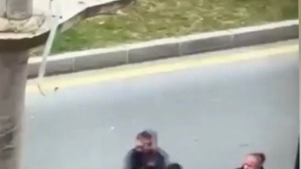 Motosiklet sürücüsü ve hafif ticari araç sürücüsünün kavgası çevredeki kişiler tarafından cep telefonuyla kaydedildi. Görüntülerde, çıkan tartışmanın kısa sürede büyüyerek kavga dönüştüğü, tarafların birbirine saldırdığı anlar görüntülendi. (DHA)
