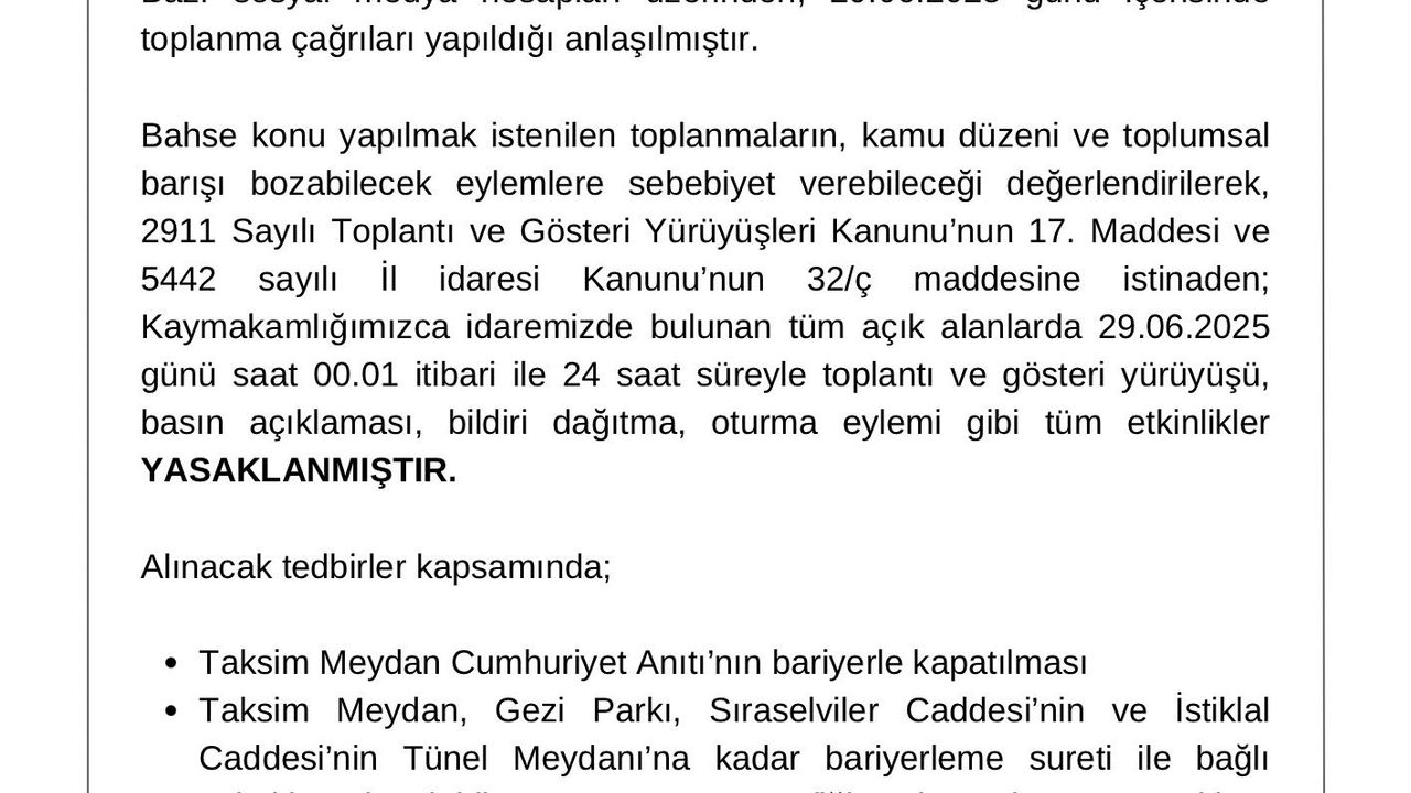 Beyoğlu Kaymakamlığı yaptığı açıklamada ilçe genelinde 1 gün süreyle gösteri, yürüyüş ve açık hava toplantılarının yasaklandığını duyurdu. Açıklamada, “Bazı sosyal medya hesapları üzerinden; 29.06.2025 günü içerisinde toplanma çağrıları yapıldığı anlaşılmıştır. Bahse konu yapılmak istenilen toplanmaların, kamu düzeni ve toplumsal barışı bozabilecek eylemlere sebebiyet verebileceği değerlendirilerek, 2911 Sayılı Toplantı ve Gösteri Yürüyüşleri Kanunu'nun 17. Maddesi ve 5442 sayılı İl idaresi Kanunu'nun 32/ç maddesine istinaden; Kaymakamlığımızca idaremizde bulunan tüm açık alanlarda 29.06.2025 günü saat 00.01 itibari ile 24 saat süreyle toplantı ve gösteri yürüyüşü, basın açıklaması, bildiri dağıtma, oturma eylemi gibi tüm etkinlikler yasaklanmıştır.