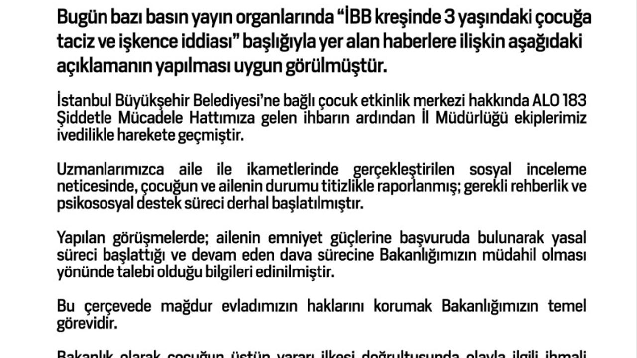 Konuya ilişkin açıklamada bulunan Aile ve Sosyal Hizmetler Bakanlığı, 'İstanbul Büyükşehir Belediyesi'ne bağlı çocuk etkinlik merkezi hakkında ALO 183 Şiddetle Mücadele Hattımıza gelen ihbarın ardından İl Müdürlüğü ekiplerimiz ivedilikle harekete geçmiştir. Uzmanlarımızca aile ile ikametlerinde gerçekleştirilen sosyal inceleme neticesinde, çocuğun ve ailenin durumu titizlikle raporlanmış; gerekli rehberlik ve psikososyal destek süreci derhal başlatılmıştır. Yapılan görüşmelerde; ailenin emniyet güçlerine başvuruda bulunarak yasal süreci başlattığı ve devam eden dava sürecine Bakanlığımızın müdahil olması yönünde talebi olduğu bilgileri edinilmiştir. Bu çerçevede mağdur evladımızın haklarını korumak Bakanlığımızın temel görevidir. Bu çerçevede mağdur evladımızın haklarını korumak Bakanlığımızın temel görevidir. Bakanlık olarak çocuğun üstün yararı ilkesi doğrultusunda olayla ilgili ihmali bulunanların en ağır cezayı almaları için yargı sürecine müdahil olarak yakından takip edeceğiz' ifadeleri kullanıldı.