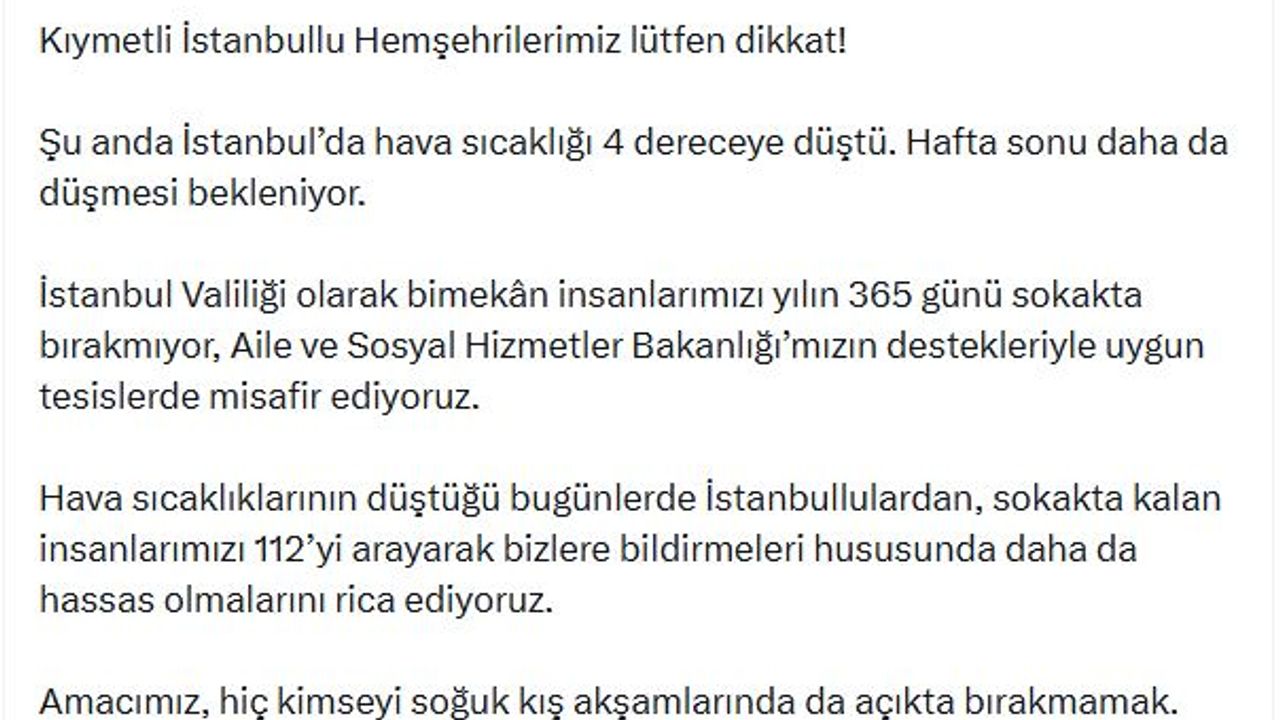 İSTANBUL, (DHA)- İSTANBUL Valisi Davut Gül, sanal medya hesabından yaptığı paylaşımda İstanbul'da hava sıcaklığının 4 dereceye düştüğünü belirterek, 'İstanbul Valiliği olarak bimekan insanlarımızı yılın 365 günü sokakta bırakmıyor, Aile ve Sosyal Hizmetler Bakanlığı'mızın destekleriyle uygun tesislerde misafir ediyoruz. Hava sıcaklıklarının düştüğü bugünlerde İstanbullulardan, sokakta kalan insanlarımızı 112'yi arayarak bizlere bildirmeleri hususunda daha da hassas olmalarını rica ediyoruz. Amacımız, hiç kimseyi soğuk kış akşamlarında da açıkta bırakmamak.' ifadelerini kullandı. (DHA)