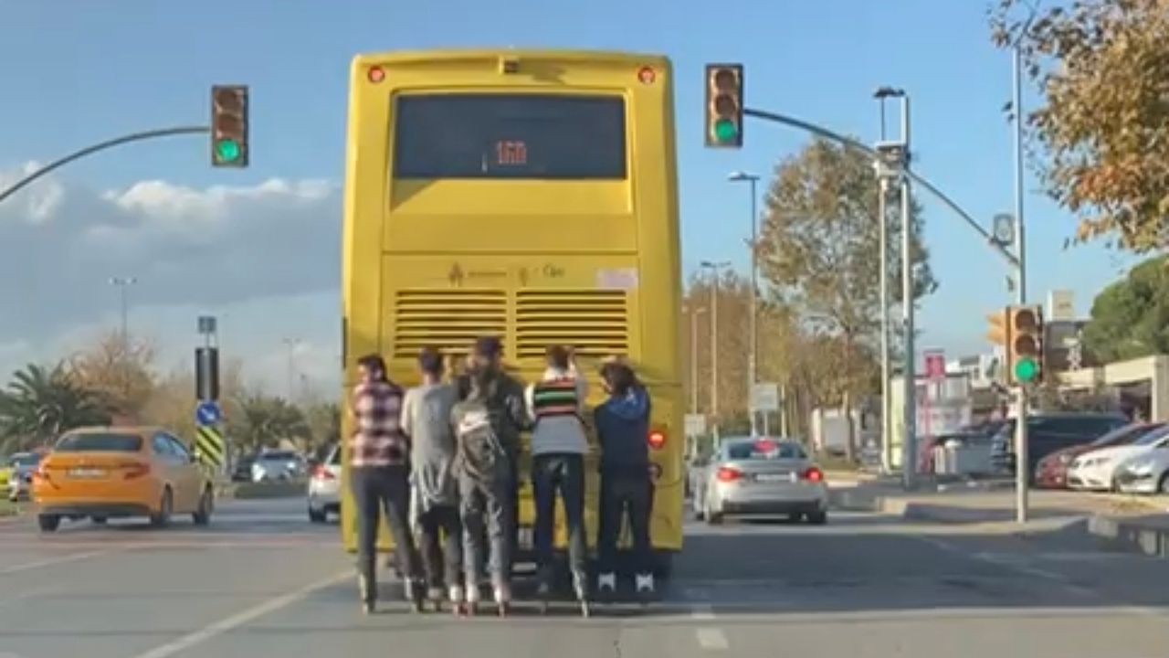 Olay, öğle saatlerinde Maltepe Sahil Yolu Bostancı istikametinde meydana geldi. Edinilen bilgiye göre patenli 6 kişi, trafikte seyir halindeki bir İETT otobüsünün arkasına tutunarak ilerlemeye başladı. Yoğun trafikte kendi can güvenliklerini tehlikeye atan gençler, aynı zamanda trafikteki diğer sürücüler için de risk oluşturdu. Patenle tehlikeli yolculuk bir sürücünün cep telefonu kamerasına yansıdı. Görüntülerde, 6 kişinin seyir halindeki otobüse tutundukları anlar yer aldı. (DHA)