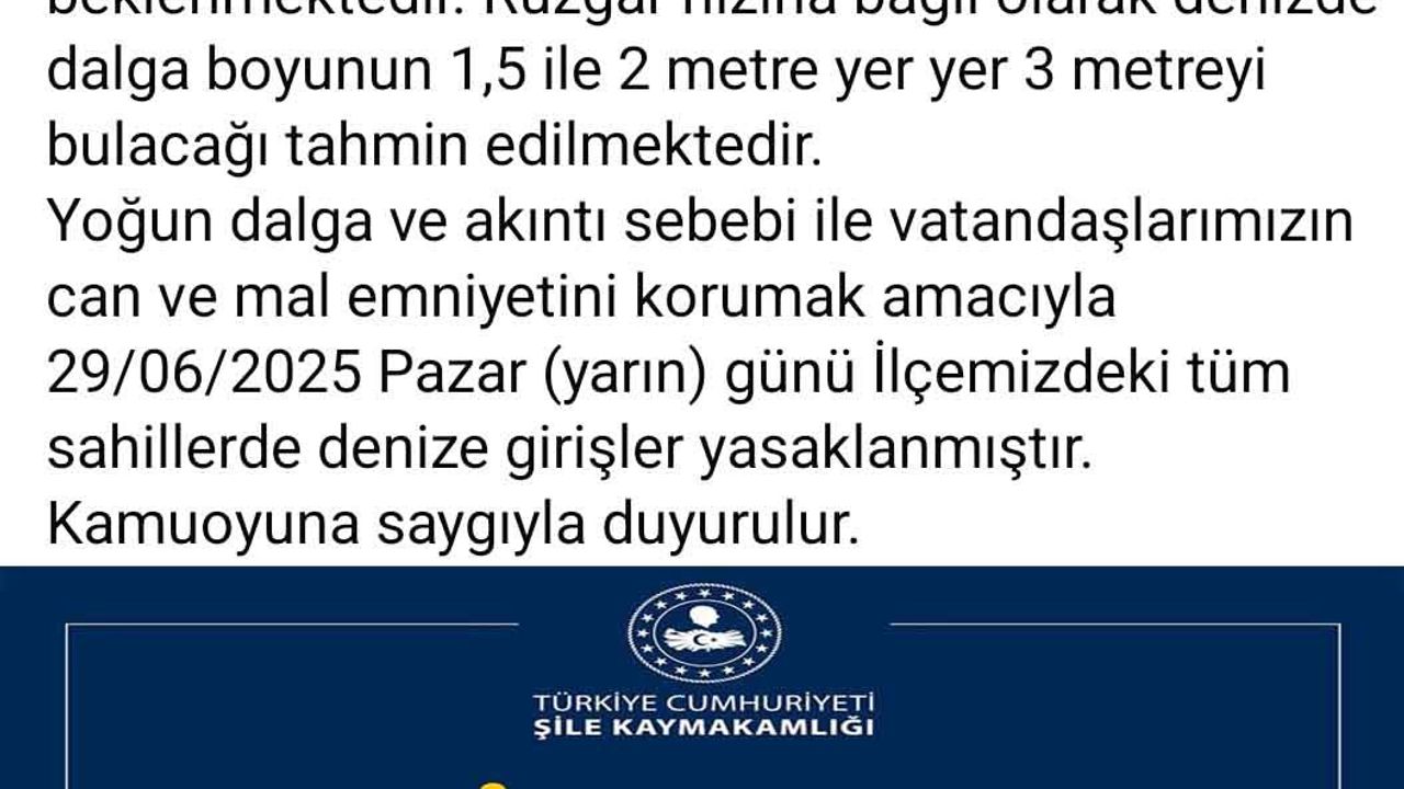 Şile Kaymakamlığı'nın sosyal medya hesabından yapılan açıklamada, “Sevgili vatandaşlarımızın dikkatine; Meteoroloji Genel Müdürlüğü hava ve deniz raporlarından alınan bilgiye göre 29/06/2025 Pazar günü ilçemizde havanın çok bulutlu ve yer yer sağanak yağışlı olması beklenmektedir. Yağışa bağlı olarak rüzgarın kuzey (yıldız) ve kuzeydoğudan (poyraz) zamanla kuzeybatıdan (karayel) 4-6 ve 7 kuvvetinde eseceği beklenmektedir. Rüzgar hızına bağlı olarak denizde dalga boyunun 1,5 ile 2 metre, yer yer 3 metreyi bulacağı tahmin edilmektedir. Yoğun dalga ve akıntı sebebi ile vatandaşlarımızın can ve mal emniyetini korumak amacıyla 29/06/2025 Pazar günü İlçemizdeki tüm sahillerde denize girişler yasaklanmıştır. Kamuoyuna saygıyla duyurulur" ifadeleri yer aldı.(DHA)