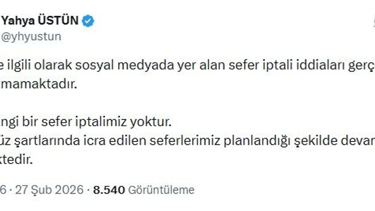THY İletişim Başkanı Yahya Üstün, sana medya hesabından yaptığı paylaşımda, 'İran ile ilgili olarak sosyal medyada yer alan sefer iptali iddiaları gerçeği yansıtmamaktadır. Herhangi bir sefer iptalimiz yoktur. Gündüz şartlarında icra edilen seferlerimiz planlandığı şekilde devam etmektedirö ifadelerini kullandı. (DHA)