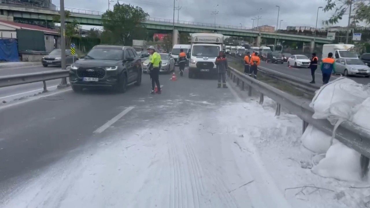 Özgür EREN/İSTANBUL, (DHA)- ZEYTİNBURNU, D-100 Karayolu'nda toz alçı yüklü TIR, bariyerlere çarptı. Kazanın ardından TIR'daki alçılar yola saçılırken, D-100'de trafik oluştu.