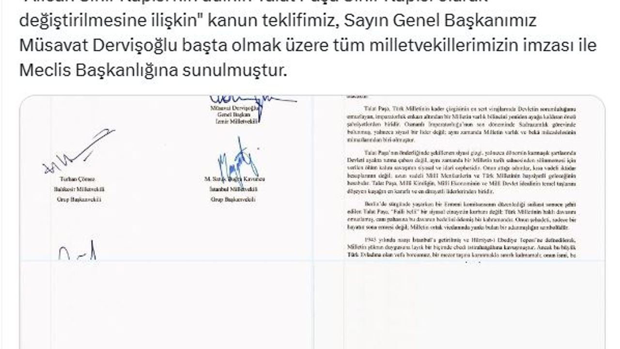 İYİ Parti Genel Başkanı Müsavat Dervişoğlu ve 28 milletvekilinin imzasıyla TBMM Başkanlığına sunulan kanun teklifinde, "Tarih, yalnızca olup bitenlerin kaydı değildir; aynı zamanda milletlerin kimliğini inşa eden, hafızasını diri tutan ve gelecek nesillere aktarılan büyük mücadelelerin, büyük liderlerin ve büyük fikirlerin mirasıdır. Bu mirası yaşatmak, devlet aklının olduğu kadar, millet vicdanının da en temel sorumluluğudur. İşte bu sorumluluğun bir gereği olarak; önemli sınır kapılarımızdan biri olan Alican Sınır Kapısı'nın, 'Talat Paşa Sınır Kapısı' olarak yeniden adlandırılması, tarihimize, bağımsızlık mücadelemize ve milli hafızamıza sahip çıkma iradesinin somut bir tezahürü olacaktır. Talat Paşa, Türk milletinin kader çizgisinin en sert virajlarında Devletin sorumluluğunu omuzlayan, imparatorluk enkazı altından bir milletin varlık bilincini yeniden ayağa kaldıran öncü şahsiyetlerden biridir. Osmanlı İmparatorluğu’nun son döneminde sadrazamlık görevinde bulunmuş, yalnızca siyasi bir lider değil; aynı zamanda milletin varlık ve beka mücadelesinin mimarlarından biri olmuştur" denildi.
