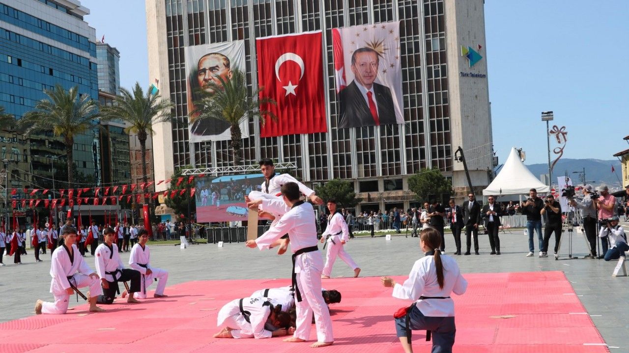 Konuşmaların ardından Gençlik ve Spor Bakanı Osman Aşkın Bak'ın mesajı ve şiirler okundu ve Atatürk'ün Gençliğe Hitabesi seslendirildi. 'Gençliğin Ata'ya Cevabı'nın Atatürk ve bayrak posteri gösterisi ile okunmasının ardından Gençlik ve Spor İl Müdürlüğü, Dokuz Eylül Üniversitesi, İzmir Yüksek Teknoloji Üniversitesi tarafından hazırlanan halk oyunları ve spor gösterileri sunuldu. Meydandaki gösterileri izleyenler, ellerinde Türk bayraklarıyla bayram coşkusuna ortak oldu. Dev Türk bayrağı ile Atatürk posteri açılmasının ardından tören sona erdi. (DHA)