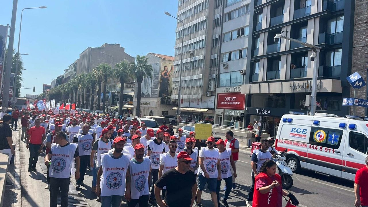 Türk-İş'e bağlı Belediye-İş Sendikası, İzmir Büyükşehir Belediyesi'nden 360 işçinin çıkarıldığını açıkladı. 8 Temmuz'da toplanıp, Başkan Cemil Tugay'ın ofisinin de yer aldığı Egemenlik Binası'na yürüyen işçiler, eylemlerini Egemenlik binası önünde sürdürdü. Bugün de bir araya gelen işçiler, Egemenlik Binası'ndan Kültürpark'taki İzmir Büyükşehir Belediyesi meclisinin temmuz ayı olağan birleşiminin yapılacağı salona yürüdü. Belediye-İş Sendikası İzmir 2 Nolu Şube Başkanı Savaş Atalay, meclise katılmak istediklerini söyledi.