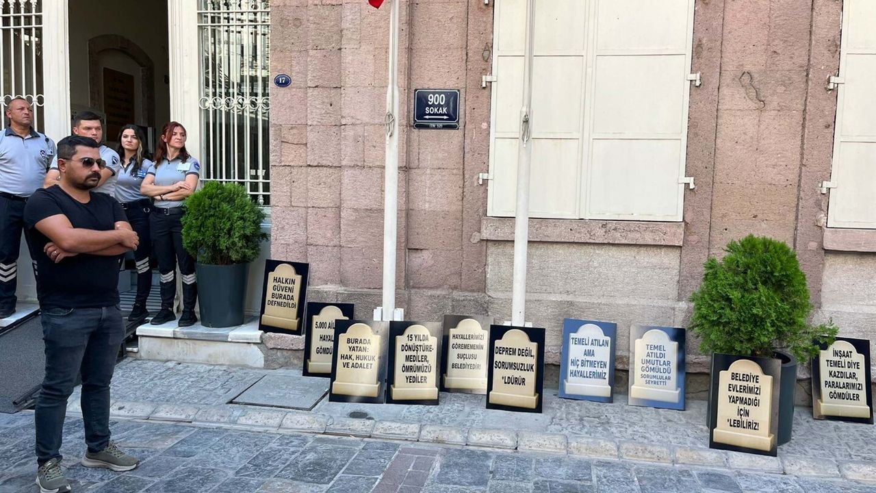 İzmir’de kentsel dönüşüm projelerinde yaşanan aksaklıklar nedeniyle mağduriyet yaşayan kooperatif üyeleri, İzmir Büyükşehir Belediyesi Egemenlik Binası önünde basın açıklaması yaptı. Ödemelerini yaptıkları depreme dayanıklı evlerini istediklerini belirtip, İzmir Büyükşehir Belediye Başkanı Cemil Tugay’a seslenen mağdurlar, ellerinde tuttukları mezar taşı dövizlerini bina önüne bıraktı. Dövizlerde 'İnşaat temeli diye kazdılar paramızı gömdüler', 'Deprem değil, sorumsuzluk öldürür', '5000 ailenin hayalini gömdünüz', 'Burada yatan: Hak, Hukuk ve Adalet' ifadeleri dikkat çekti.
