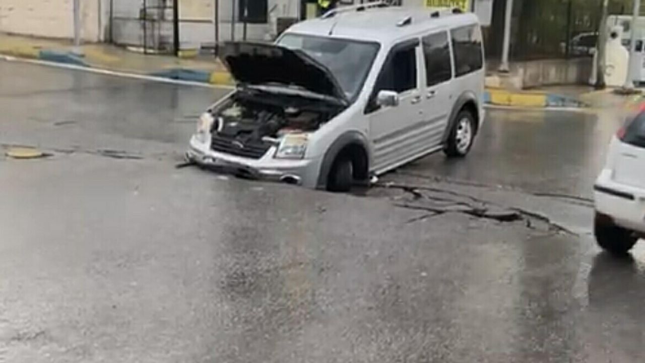 İzmir’de sabah saatlerinde etkili olan sağanak nedeniyle Buca ilçesinde bir yolda göçük oluştu. O esnada seyir halinde olan bir hafif ticari aracın ön kısmı göçen yola düştü. Araçta hasar meydana gelirken, olay yerine polis sevk edildi. Araç, çekici tarafından göçükten çıkarıldı. (DHA)