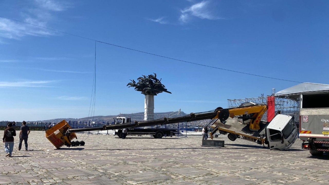 Olay, bugün 14.30 sıralarında Gündoğdu Meydanı'nda meydana geldi. 19 Mayıs'ta CHP lideri Özgür Özel'in katılacağı miting için sahne kurma çalışmaları yapıldığı sırada bir vinç, şoförünün direksiyon kontrolünü yitirmesi sonucu devrildi. Vinç şoförü hafif yaralandı.
