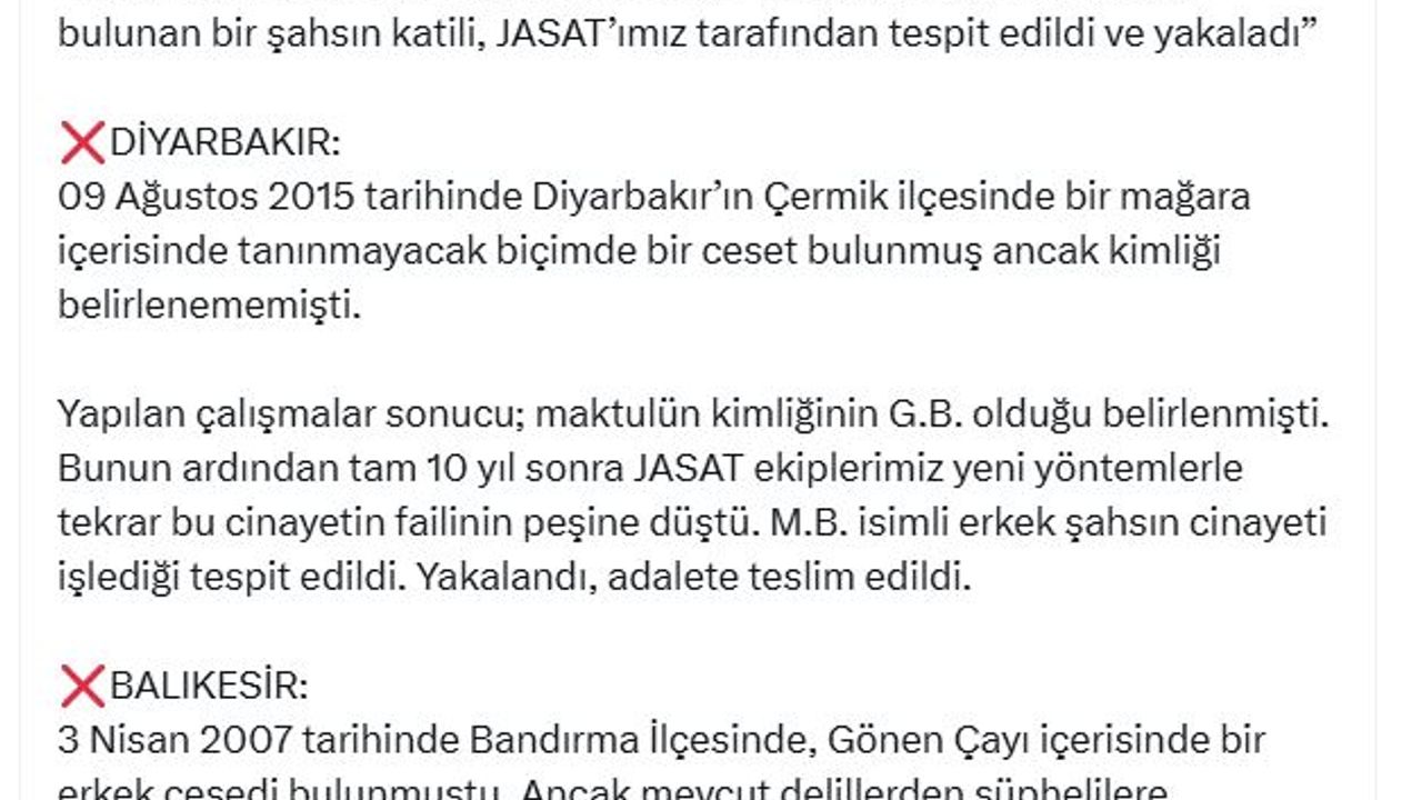 İçişleri Bakanı Ali Yerlikaya, JASAT tarafından yapılan çalışmaları sosyal medya hesabından paylaştı. Buna göre; 9 Ağustos 2015’te Diyarbakır'ın Çermik ilçesinde bir mağara içerisinde tanınmayacak biçimde bir ceset bulundu. Yapılan çalışmalar sonucu maktulün kimliğinin G.B. olduğu belirlendi. Olaydan 10 yıl sonra JASAT ekipleri yeni yöntemlerle failin peşine düştü. M.B. isimli erkek şüphelinin cinayeti işlediği tespit edildi. Yakalanan şüpheli, adalete teslim edildi.