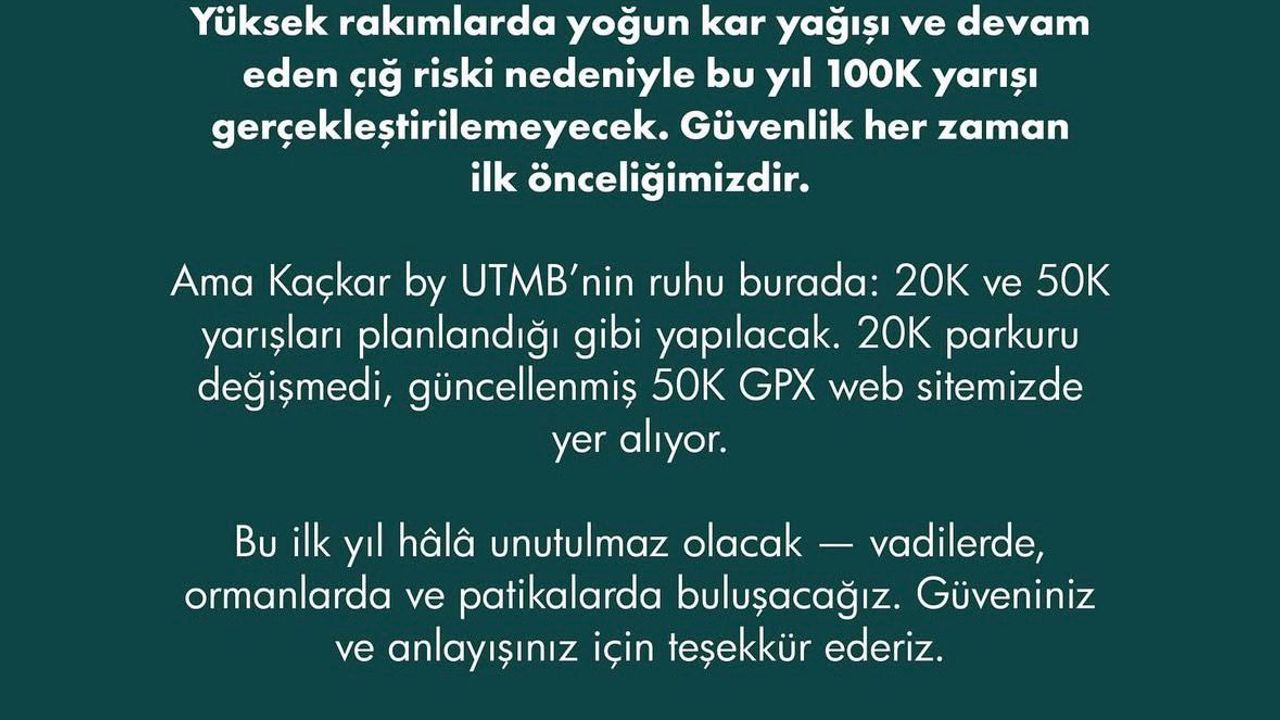 Gençlik ve Spor Bakanlığı’nın himayesinde, Rize Valiliği’nin koordinasyonunda 27-28 Eylül tarihlerinde Rize- Kaçkar Dağları'nda gerçekleştirilmesi planlanan Ultra-Trail du Mont-Blanc (UTMB) Dünya Serisi'nin Türkiye etabı olan ‘Kaçkar by UTMB’ye ilişkin yeni gelişme yaşandı. Kaçkar by UTMB'den yapılan yazılı açıklamada, yüksek rakımlarda yoğun kar ve çığ riski bulunduğu gerekçesiyle, Kaçkar by UTMB’de 100K parkurunun çığ riski nedeniyle yapılamayacağı duyuruldu. Açıklamada, "Güvenlik her zaman ilk önceliğimizdir ama Kaçkar by UTMB'nin ruhu burada. 20K ve 50K yarışları planlandığı gibi yapılacak. 20K parkuru değişmedi, güncellenmiş 50K GPX web sitemizde yer alıyor. Unutulmaz olacak vadilerde, ormanlarda ve patikalarda buluşacağız” denildi.