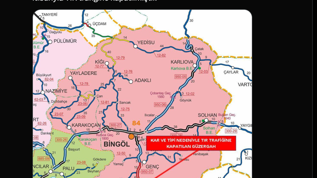 Bingöl Valiliği'nin sanal medya hesabından yapılan açıklamada, Bingöl-Diyarbakır ve Bingöl-Muş kara yollarının yoğun kar yağışı nedeniyle TIR trafiğine kapatıldığı belirtildi. Açıklamada, 'Bingöl-Diyarbakır Devlet Yolunun 0-31 kilometreleri arası (Genç ilçe girişi ile Diyarbakır il sınırı arası) yoğun kar yağışı ve tipi nedeniyle saat 18.40 itibarıyla TIR trafiğine kapatılmıştır. Bingöl-Muş Devlet Yolu'nun 0-61 kilometreleri arası (Kervansaray Kavşağı ile Bingöl- Muş İl sınırı arası) yoğun kar yağışı ve tipi nedeniyle saat 18.40 itibarıyla TIR trafiğine kapatılmıştır' denildi.