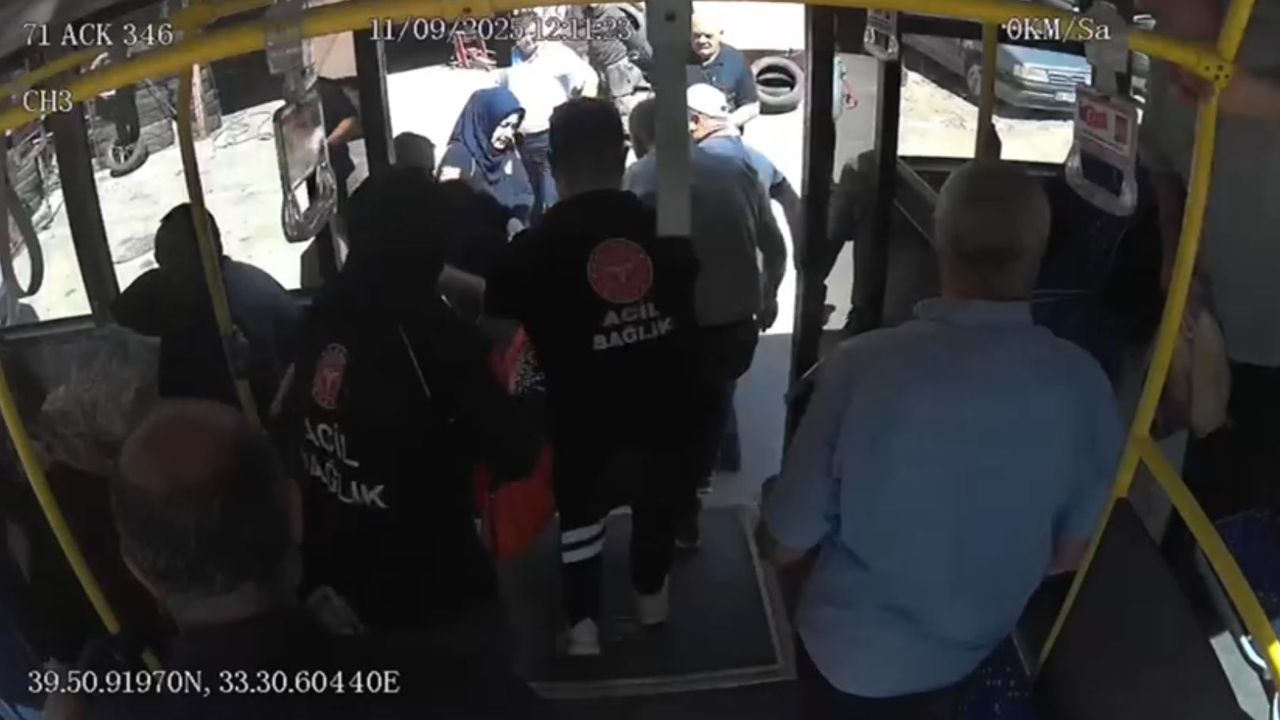 Kırıkkale Belediyesi’ne bağlı Kimeski hattında hizmet veren 71 ACK 346 plakalı halk otobüsünde yolculuk eden Perihan İme, Kimeski Mahallesi’ne doğru seyahat sırasında aniden rahatsızlandı. İme’ye ilk müdahaleyi otobüsteki yolcular yaptı. Otobüs şoförü Mehmet Ugantaş ise durumu hemen 112 Acil Çağrı Merkezi’ne bildirerek yetkililerle sürekli irtibat halinde kaldı. Kadının sağlık durumu kötüleşince, şoför güzergâhı değiştirerek en uygun noktada ambulans ekipleriyle buluştu. Perihan İme, olay yerine sevk edilen ambulansa teslim edildi. O anlar, halk otobüsünün güvenlik kamerası tarafından saniye saniye kaydedildi. (DHA)