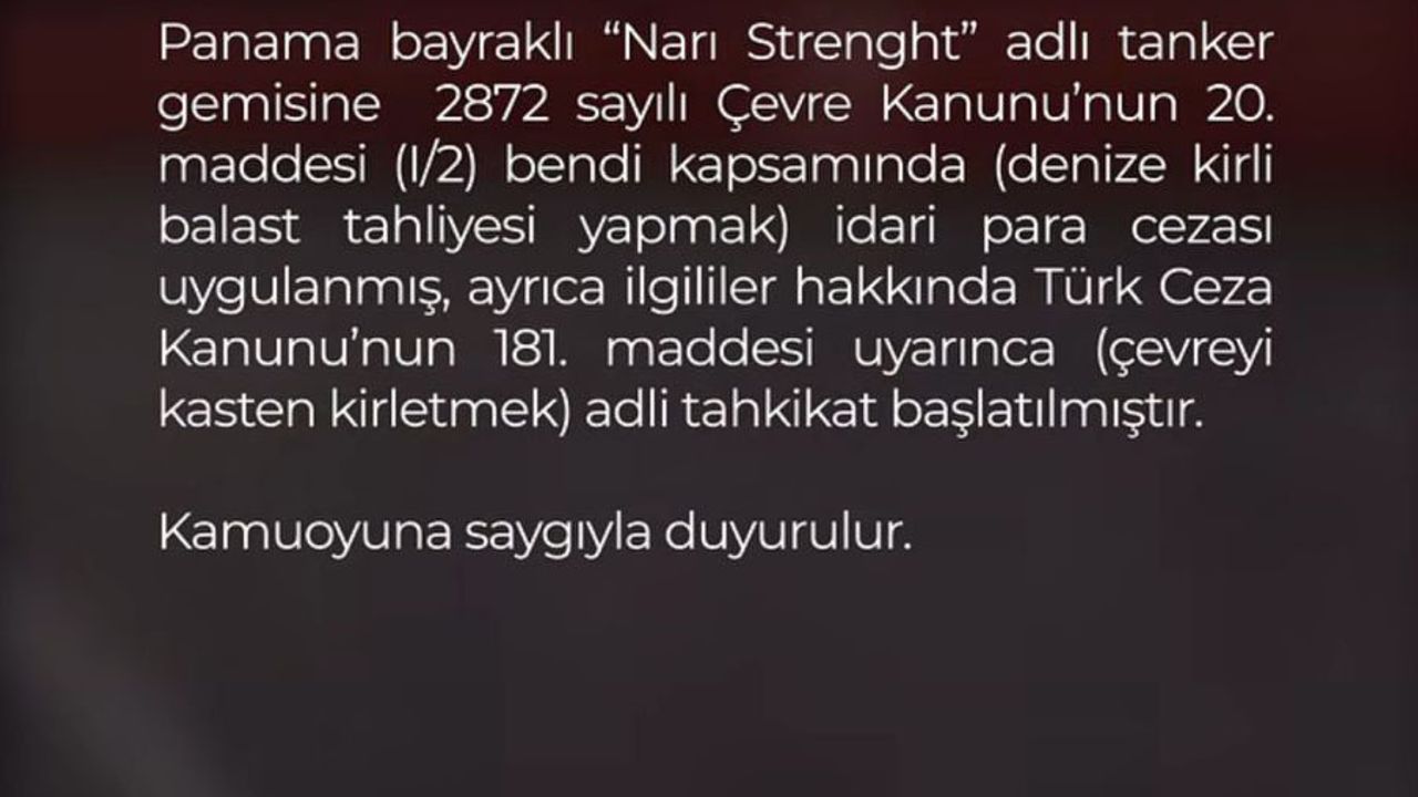 Konu ile ilgili Yalova Valiliği'nin sanal medya hesabından yapılan açıklamada, 'Yalova kamuoyuna; ilimiz açıklarında kirli balast suyunun denize boşaltıldığına dair haberlere istinaden söz konusu gemiye gereği yapıldı. Panama bandıralı 'Narı Strenght' adlı tanker gemisine 2872 sayılı Çevre Kanunu'nun 20. maddesi (I/2) bendi kapsamında (Denize kirli balast tahliyesi yapmak) idari para cezası uygulanmış, ayrıca ilgililer hakkında Türk Ceza Kanunu'nun 181. maddesi uyarınca (Çevreyi kasten kirletmek) adli tahkikat başlatılmıştır' ifadeleri kullanılarak 'Gereği yapıldı' denildi. (DHA)