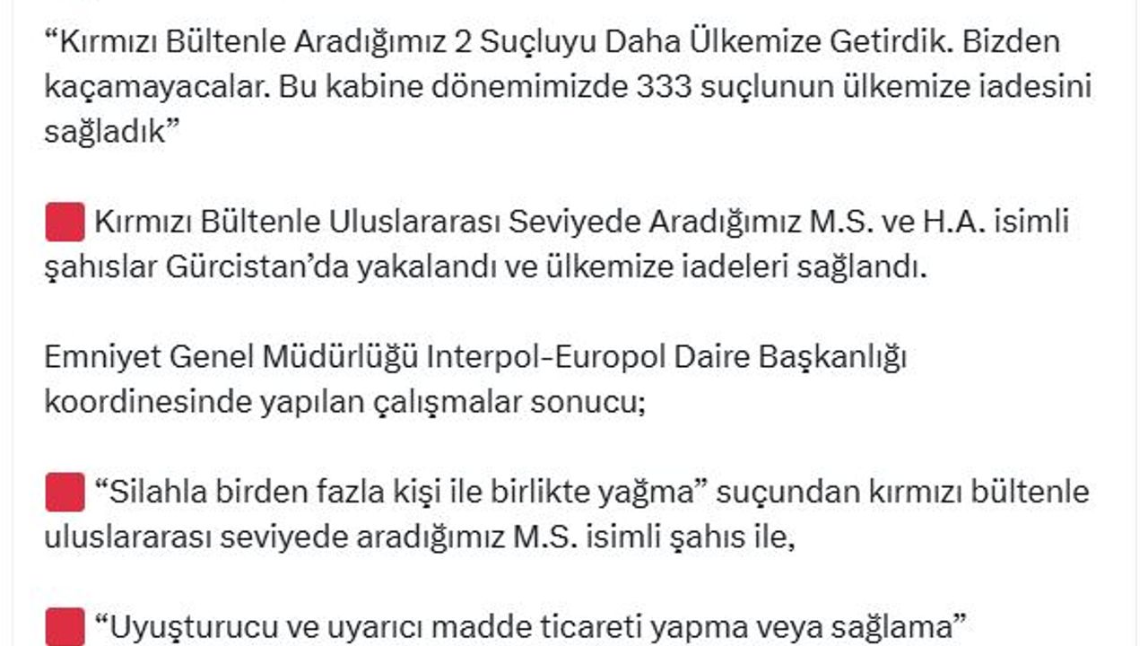 İçişleri Bakanı Yerlikaya'nın sosyal medya hesabından yaptığı açıklamaya göre; Emniyet Genel Müdürlüğü Interpol-Europol Daire Başkanlığı koordinesinde yapılan çalışmalar sonucu, kırmızı bültenle aranan 2 suçlu Gürcistan'da yakalanarak Türkiye'ye iadeleri sağlandı. Yakalananlardan M.S., 'Silahla birden fazla kişi ile birlikte yağma', H.A. ise 'Uyuşturucu ve uyarıcı madde ticareti yapma veya sağlama' suçlarından Türkiye tarafından kırmızı bültenle aranıyordu.
