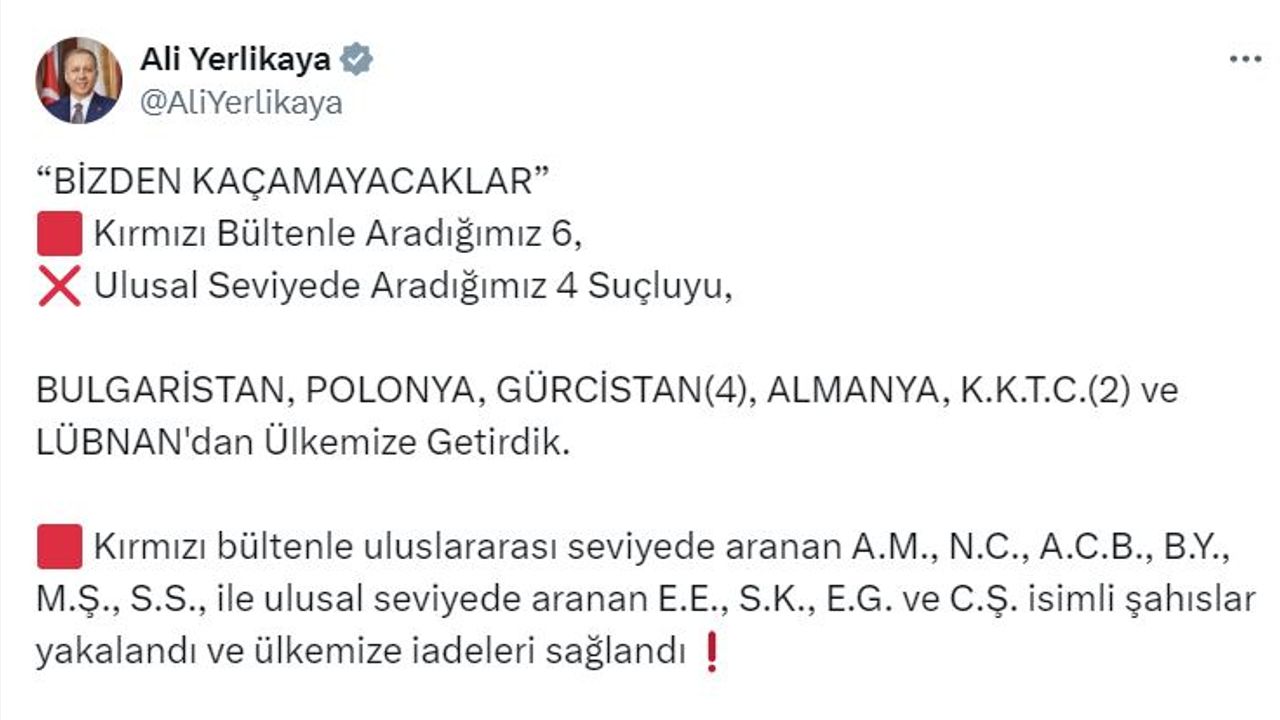Bakan Yerlikaya, sosyal medya hesabından yaptığı açıklamada, kırmızı bültenle uluslararası seviyede aranan A.M., N.C., A.C.B., B.Y., M.Ş., S.S., ile ulusal seviyede aranan E.E., S.K., E.G. ve C.Ş. isimli şüphelilerin yakalandığını ve Türkiye'ye iadelerinin sağlandığını duyurdu. Bakan Yerlikaya, yurt dışına kaçan ve haklarında arama kararı bulunan şüphelilerin izini titizlikle sürdüklerini belirterek, şunları kaydetti: