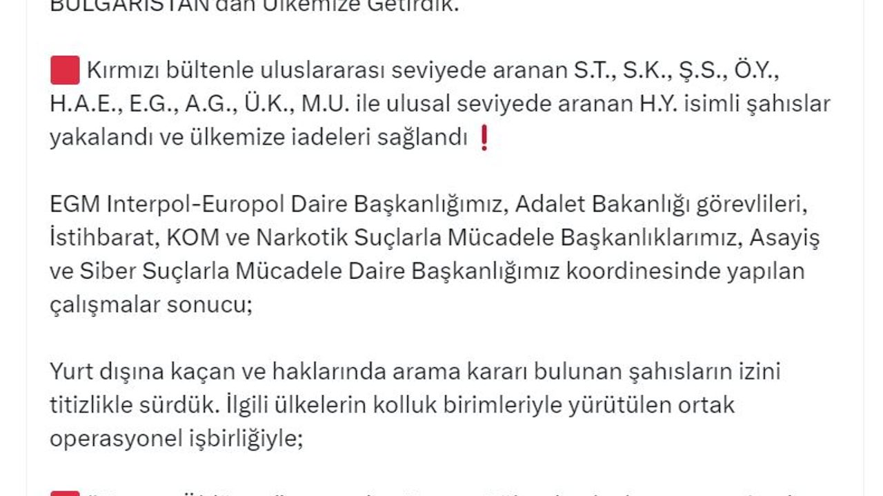 Bakan Yerlikaya, sosyal medya hesabından yaptığı açıklamada, "Kırmızı bültenle uluslararası seviyede aranan S.T., S.K., Ş.S., Ö.Y., H.A.E., E.G., A.G., Ü.K., M.U. ile ulusal seviyede aranan H.Y. isimli şahıslar yakalandı ve ülkemize iadeleri sağlandı" dedi.