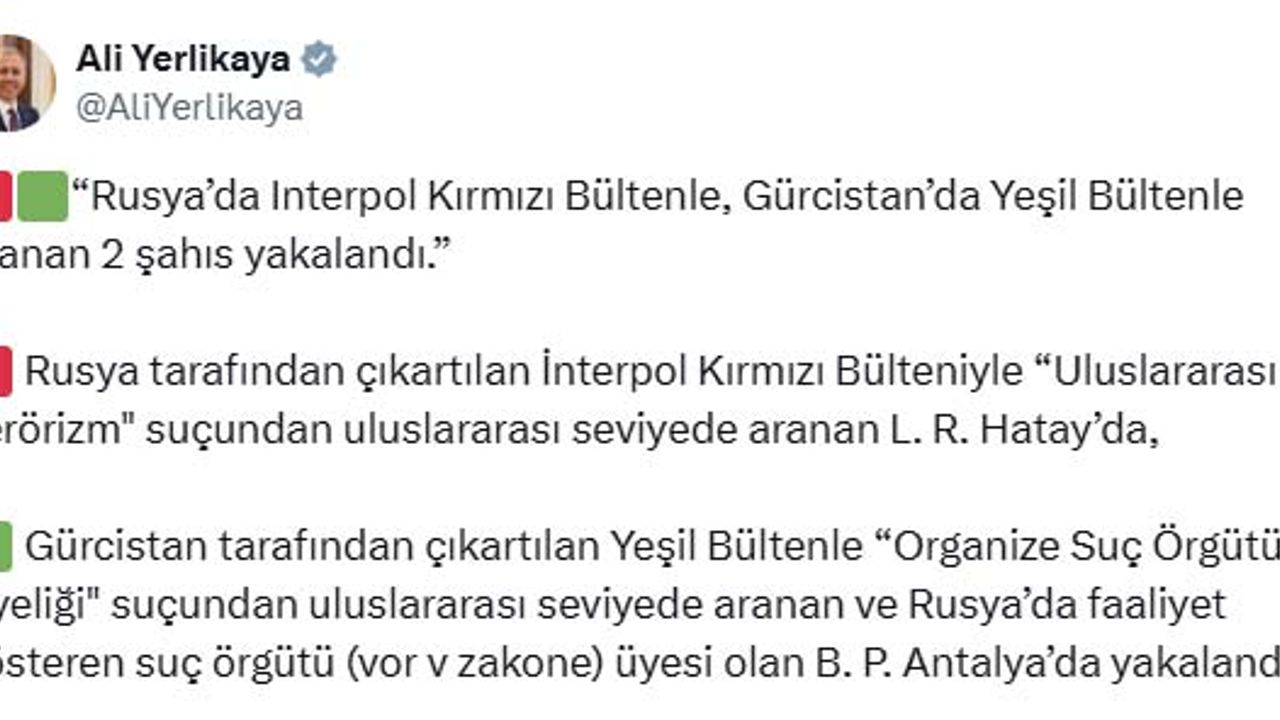 ANKARA, (DHA)-İÇİŞLERİ Bakanı Ali Yerlikaya, Interpol tarafından kırmızı bültenle aranan L.R.'nin Hatay'da, yeşil bültenle aranan B.P.'nin Antalya'da yakalandığını açıkladı.