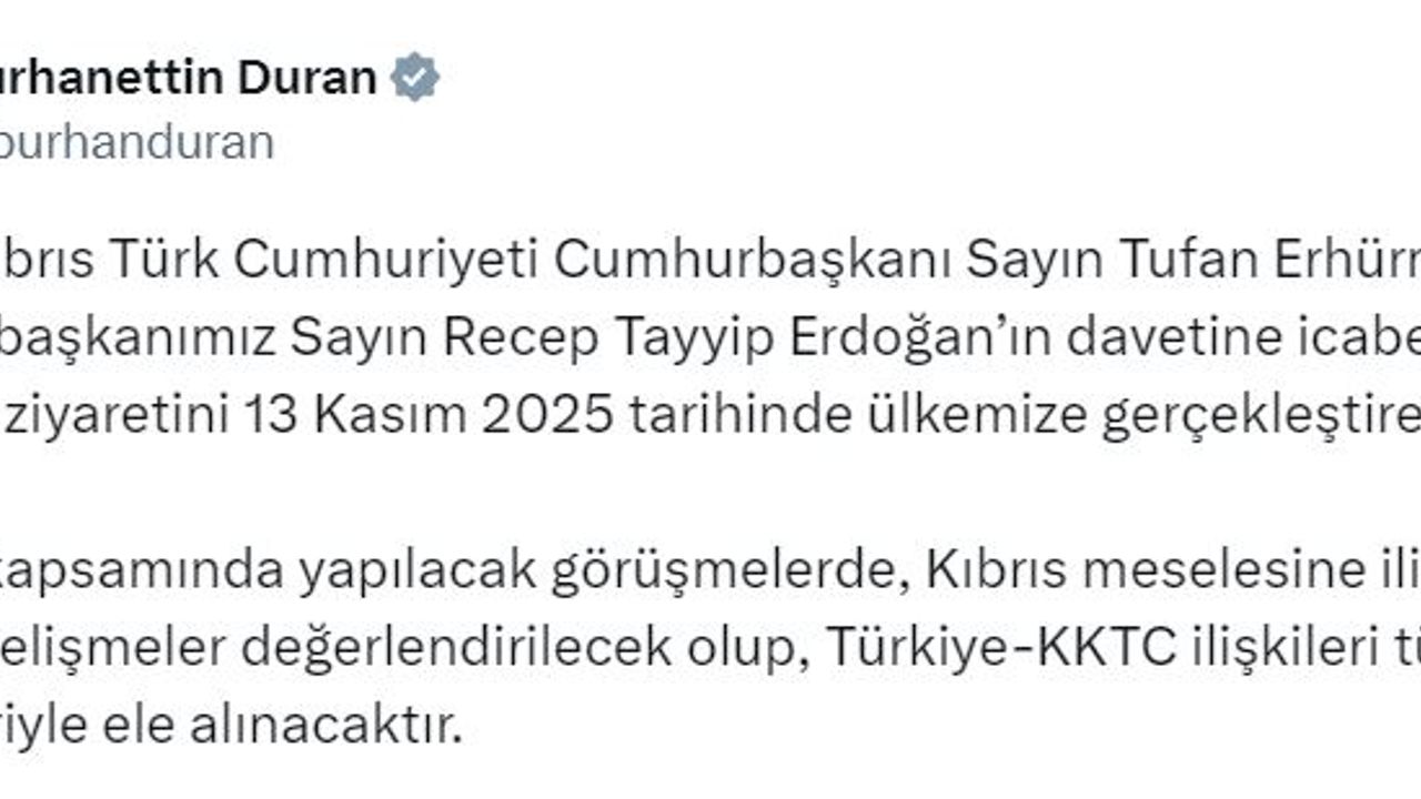 İletişim Başkanı Duran, sosyal medya hesabından yaptığı açıklamada, "Kuzey Kıbrıs Türk Cumhuriyeti Cumhurbaşkanı Sayın Tufan Erhürman, Cumhurbaşkanımız Sayın Recep Tayyip Erdoğan’ın davetine icabetle, ilk yurt dışı ziyaretini 13 Kasım 2025 tarihinde ülkemize gerçekleştirecektir. Ziyaret kapsamında yapılacak görüşmelerde, Kıbrıs meselesine ilişkin güncel gelişmeler değerlendirilecek olup, Türkiye-KKTC ilişkileri tüm veçheleriyle ele alınacaktır" dedi. (DHA)