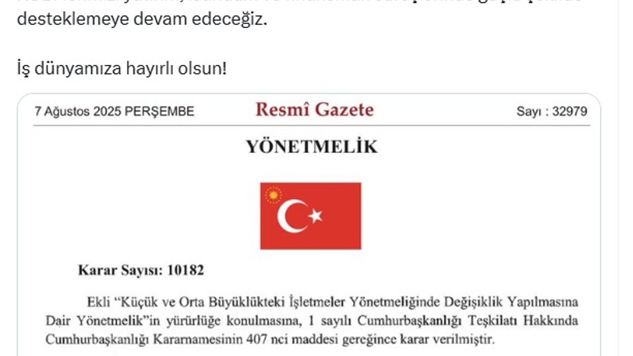 Sanayi ve Teknoloji Bakanı Mehmet Fatih Kacır, yönetmelik değişikliğine ilişkin sosyal medya hesabından yaptığı açıklamada, "Bugün Cumhurbaşkanımız Sayın Recep Tayyip Erdoğan'ın imzasıyla Resim Gazete'de yayımlanan kararla, KOBİ tanımındaki net satış hasılatı veya mali bilanço büyüklüğü sınırı 500 milyon TL'den 1 milyar TL'ye yükseldi. KOBİ'lerimizi yatırım, istihdam ve finansman süreçlerinde güçlü şekilde desteklemeye devam edeceğiz. İş dünyamıza hayırlı olsun" ifadelerini kullandı. (DHA)