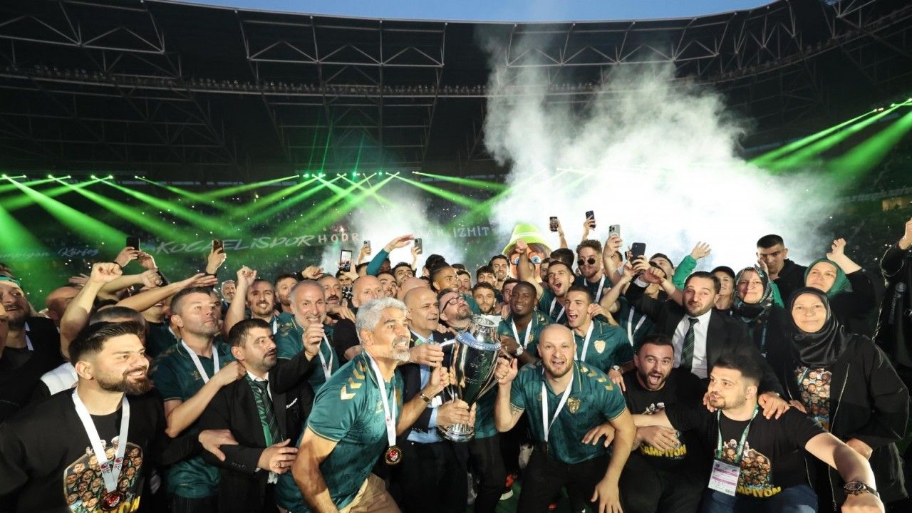 Nazım Özgün ERBULAN - Ardacan UZUN / İZMİT (Kocaeli), (DHA)- 1’İNCİ Lig’de 2024-2025 sezonunu zirvede bitirerek Süper Lig’e yükselen Kocaelispor, Kocaeli Stadı’nda şampiyonluk kupasını kaldırdı. Yeşil-siyahlı takım kupayı almasının ardından statta sanatçıların katılımıyla kutlama gerçekleştirildi.