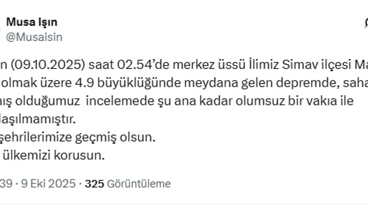 Kütahya Valisi Musa Işın, Simav ilçesinde meydana gelen 4.9 büyüklüğündeki depremin saha çalışması yapıldığını ve herhangi bir olumsuz vaka ile karşılaşılmadığını açıkladı. Vali Işın, sosyal medyadan yaptığı açıklamada, “Bugün saat 02.54’de merkez üssü İlimiz Simav ilçesi Maden köyü olmak üzere 4.9 büyüklüğünde meydana gelen depremde, sahada yapmış olduğumuz incelemede şu ana kadar olumsuz bir vaka ile karşılaşılmamıştır. Hemşehrilerimize geçmiş olsun. Allah ülkemizi korusun” dedi. Depremin ardından polis ve jandarma ekiplerinin depremin merkez üssü ve diğer bölgelerde araştırması sürüyor. (DHA)