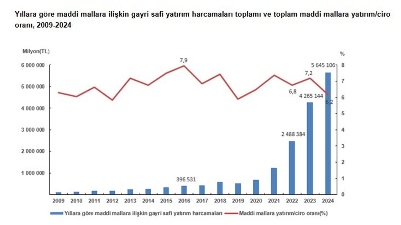 TÜİK, 2024 yılına ilişkin yıllık sanayi ve hizmet istatistikleri yatırım harcamaları verilerini açıkladı. Çalışma, 2009-2024 yıllarını kapsayacak şekilde geçmiş yıllar revize edilerek hazırlandı. Çalışmada maddi mallara ilişkin gayrisafi yatırım harcama kalemleri hesaplandı. Buna göre; maddi mallara ilişkin gayrisafi yatırım harcamaları 2024 yılında 5 trilyon 645 milyar TL olarak gerçekleşti. Harcamaların 1 trilyon 737 milyar TL'si imalat sektöründe, 885 milyar TL'si toptan ve perakende ticaret sektöründe, 617 milyar TL'si ulaştırma ve depolama sektöründe faaliyet gösteren girişimler tarafından yapıldı.