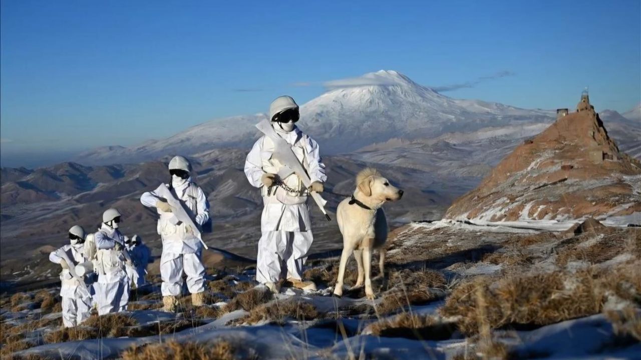 Milli Savunma Bakanlığı'nın sanal medya hesabından yapılan paylaşımda, '5'inci Hudut Tugay Komutanlığınca, zorlu hava ve arazi şartlarında, 7 gün 24 saat esasıyla hudut hattı emniyetine yönelik keşif, gözetleme, pusu ve devriye faaliyetlerine devam ediliyor' denildi. Mehmetçiğin, kış şartlarına uyumlu kamuflajları ile karla kaplı dağlık arazide devriye görevi icra ederken çekilen fotoğrafları da paylaşıldı. (DHA)