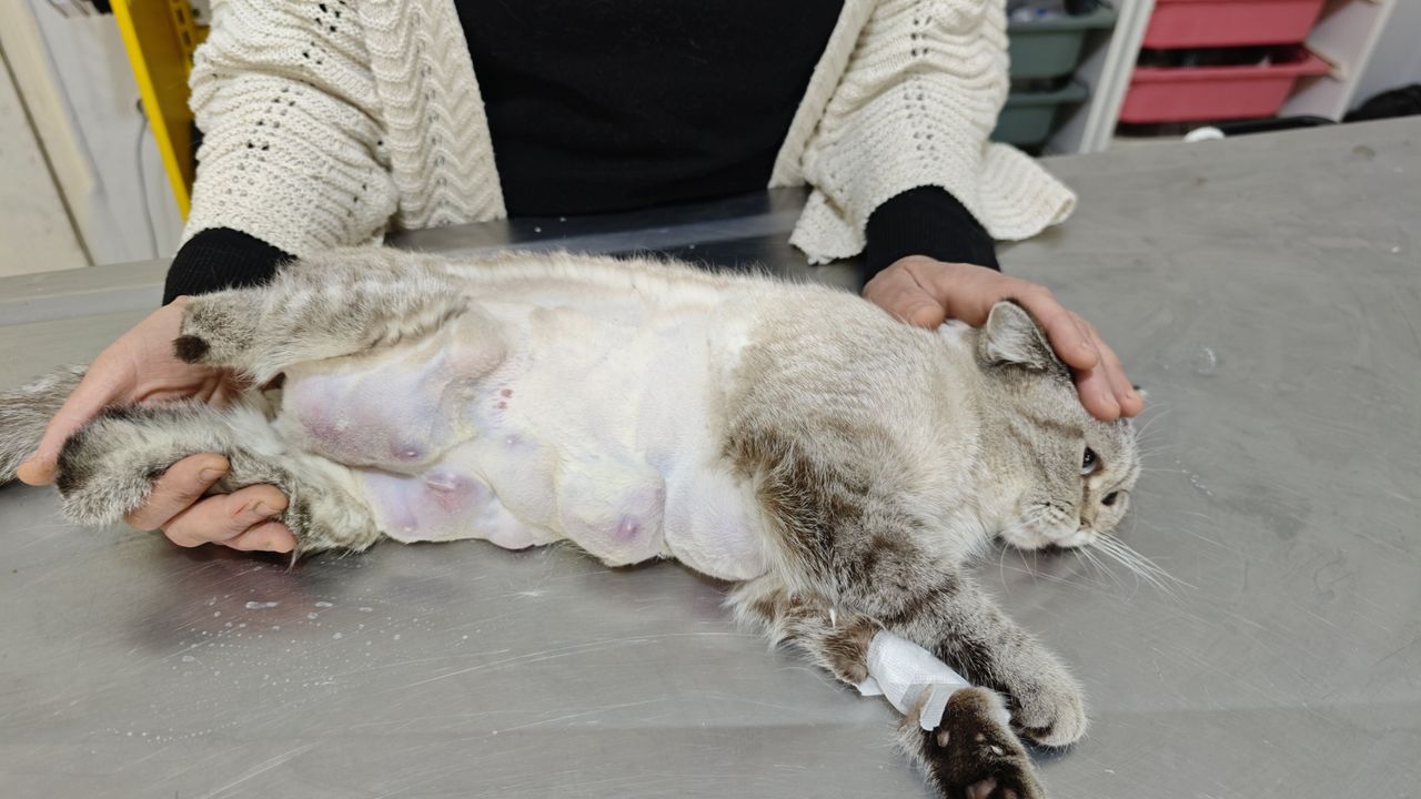 İbrahim EMÜL/OSMANİYE, (DHA)- OSMANİYE'de bir hayvansever tarafından çöp konteyneri yanında bulunup sahiplenilen, arka patileri kesilmiş haldeki kediye meme kanseri teşhisi konuldu. Yaklaşık 3 saat süren operasyonla vücudundan 330 gram tümör alınan kedi, hayata tutunmaya çalışıyor.