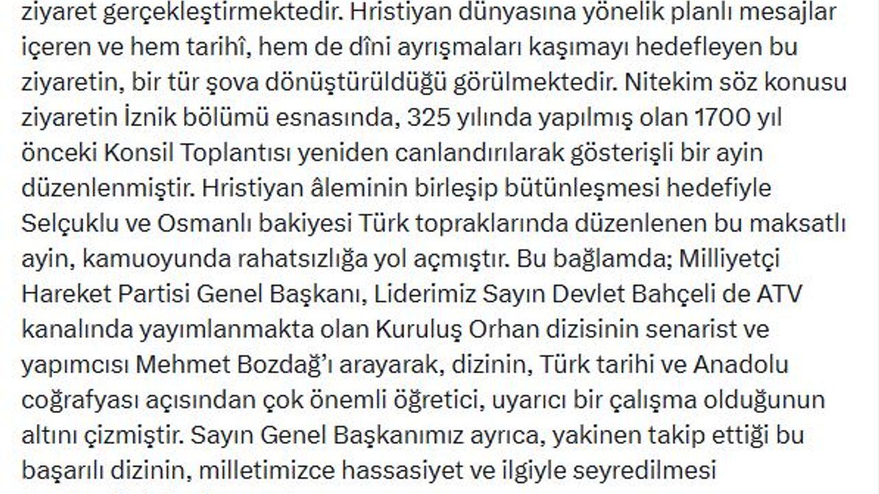 MHP Genel Başkan Yardımcısı Semih Yalçın, sosyal medya hesabından yaptığı açıklamada, "Bilindiği üzere Papa 14'üncü Leo, 27 Kasım-2 Aralık tarihlerinde Türkiye'ye bir ziyaret gerçekleştirmektedir. Hristiyan dünyasına yönelik planlı mesajlar içeren ve hem tarihi, hem de dini ayrışmaları kaşımayı hedefleyen bu ziyaretin, bir tür şova dönüştürüldüğü görülmektedir. Nitekim söz konusu ziyaretin İznik bölümü esnasında, 325 yılında yapılmış olan 1700 yıl önceki Konsil toplantısı yeniden canlandırılarak gösterişli bir ayin düzenlenmiştir. Hristiyan aleminin birleşip bütünleşmesi hedefiyle Selçuklu ve Osmanlı bakiyesi Türk topraklarında düzenlenen bu maksatlı ayin, kamuoyunda rahatsızlığa yol açmıştır. Bu bağlamda, Milliyetçi Hareket Partisi Genel Başkanı, liderimiz Sayın Devlet Bahçeli de 'Kuruluş Orhan' dizisinin senarist ve yapımcısı Mehmet Bozdağ'ı arayarak, dizinin Türk tarihi ve Anadolu coğrafyası açısından çok önemli öğretici, uyarıcı bir çalışma olduğunun altını çizmiştir. Sayın Genel Başkanımız ayrıca, yakinen takip ettiği bu başarılı dizinin, milletimizce hassasiyet ve ilgiyle seyredilmesi tavsiyesinde bulunmuştur" ifadelerini kullandı. (DHA)