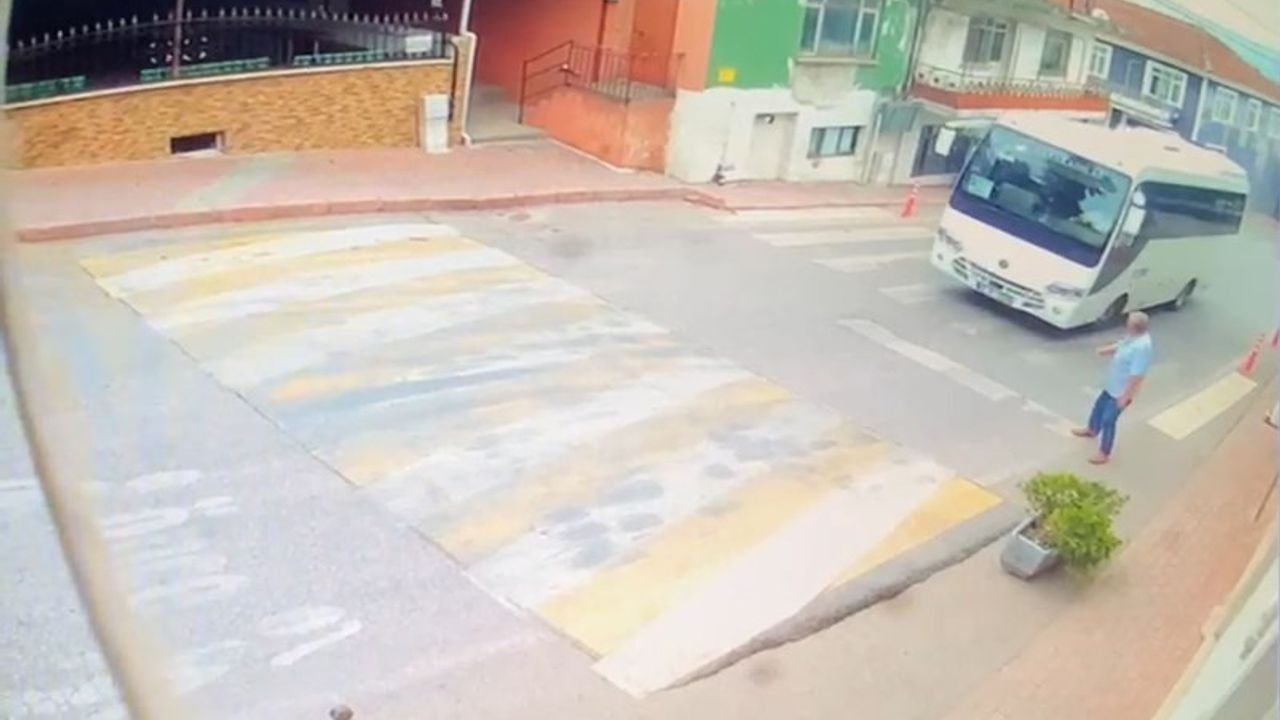 Kaza anı çevredeki güvenlik kamerasına yansıdı. Görüntüde; virajı dönen midibüsün yolun karşısına geçmekte olan M.M.’ye çarptığı ve yayanın aracın altında kaldığı anlar yer alıyor. (DHA)