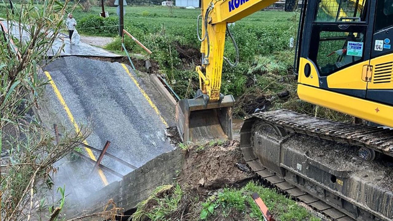 Fırat AKAY / BODRUM (Muğla), (DHA)-MUĞLA'nın Milas ilçesinde, etkili olan kuvvetli yağmur sırasında Bafa-Gölköy mahallerini birbirine bağlayan köprü çöktü. Belediye ekipleri tarafından bölgede çalışma başlatıldı.