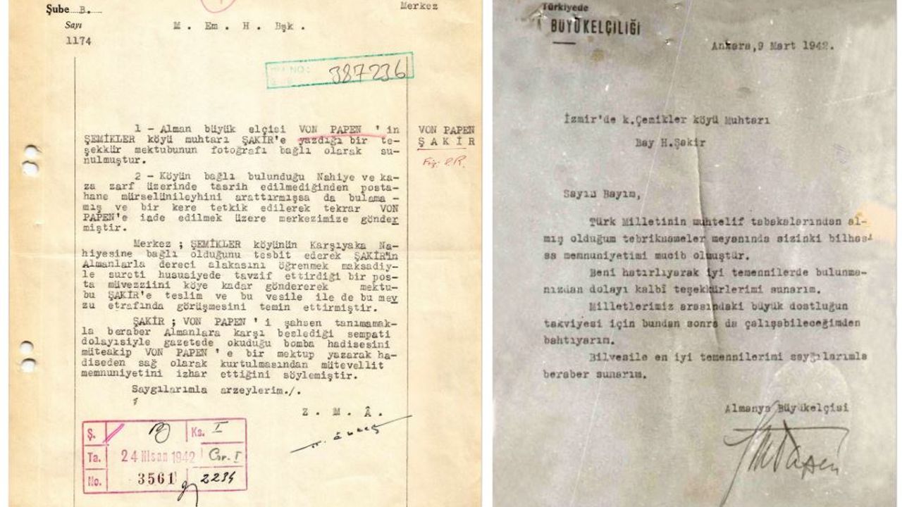 "Alman büyük elçisi Von Papen'in, Şemikler köyü muhtarı Şakir'e yazdığı bir teşekkür mektubunun fotoğrafı bağlı olarak sunulmuştur. Köyün bağlı bulunduğu nahiye ve kaza zarf üzerinde tasrih edilmediğinden postahane mürselünileyhini arattırmışsa da bulamamış ve bir kere tetkik edilerek tekrar Von Papen'e iade edilmek üzere merkezimize göndermiştir. Merkez Şemikler köyünün Karşıyaka nahiyesine bağlı olduğunu tespit ederek Şakir'in Almanlarla dereci alakasını öğrenmek maksadıyla sureti hususiyede tavzif ettirdiği bir posta müvezziini köye kadar göndererek mektubu Şakir'e teslim ve bu vesileyle de bu mevzu etrafında görüşmesini temin ettirmiştir. Şakir, Von Papen'i şahsen tanımamakla beraber Almanlara karşı beslediği sempati dolayısıyla gazetede okuduğu bomba hadisesini müteakip Von Papen'e bir mektup yazarak hadiseden sağ olarak kurtulmasından mütevellit memnuniyetini izhar ettiğini söylemiştir. Saygılarımla arz eylerim." (DHA)