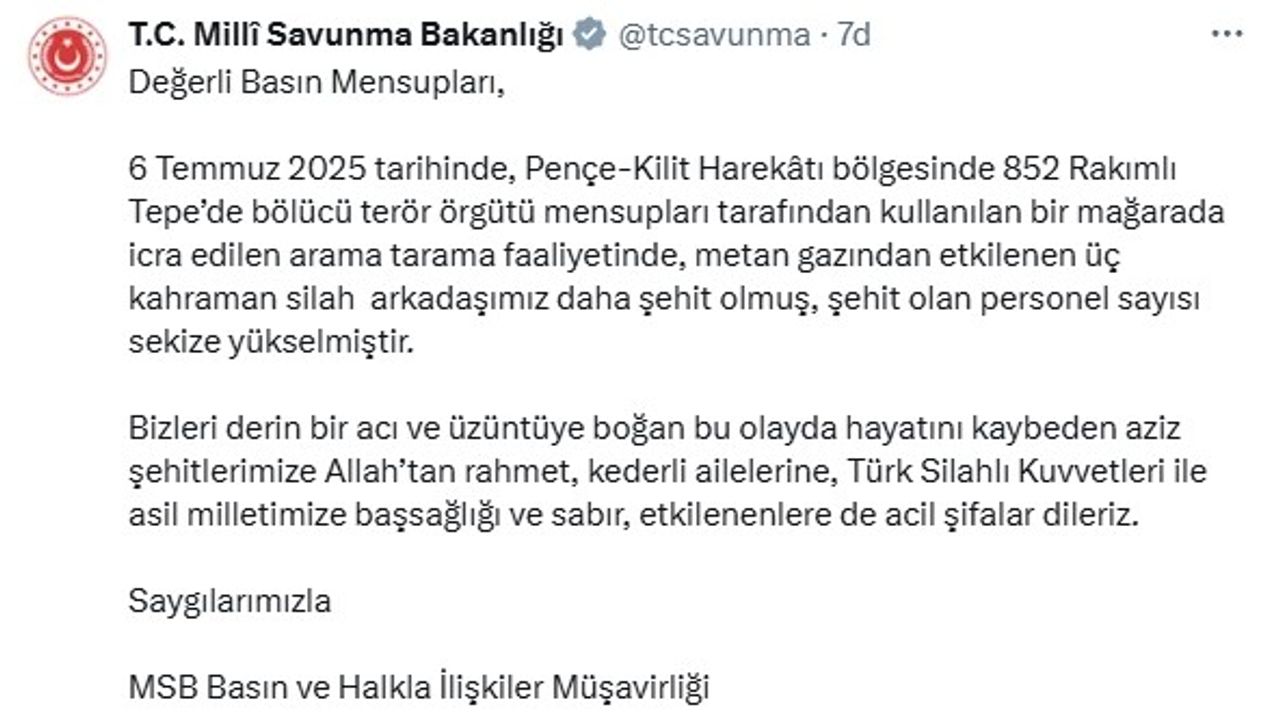 Bakanlığın sosyal medya hesabından yapılan açıklamada, “06 Temmuz 2025 tarihinde, Pençe-Kilit Harekâtı bölgesinde 852 Rakımlı Tepe’de bölücü terör örgütü mensupları tarafından kullanılan bir mağarada icra edilen arama tarama faaliyetinde, metan gazından etkilenen üç personelimiz daha şehit olmuş, şehit olan personel sayısı sekize yükselmiştir. Bizleri derin bir acı ve üzüntüye boğan bu olayda hayatını kaybeden aziz şehitlerimize Allah’tan rahmet, kederli ailelerine, Türk Silahlı Kuvvetleri ile asil milletimize başsağlığı ve sabır, etkilenenlere de acil şifalar dileriz" denildi. (DHA)