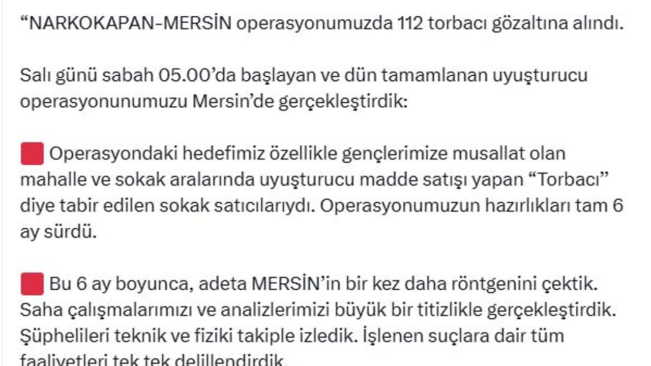 ANKARA, (DHA)- İÇİŞLERİ Bakanı Ali Yerlikaya, 'Narkokapan-Mersin' operasyonunda 'Torbacı' olarak tabir edilen 112 uyuşturucu satıcısının yakalandığını, 84'ünün tutuklandığını açıkladı.
