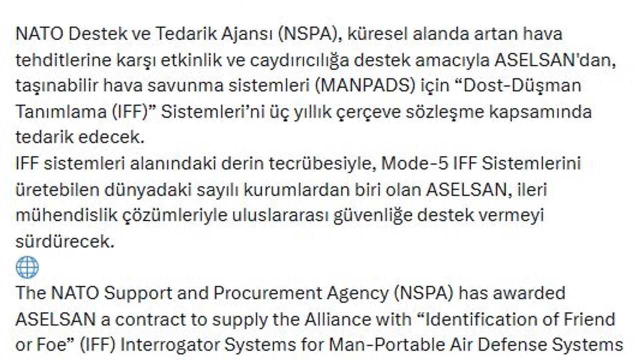 ANKARA, (DHA)- NATO Destek ve Tedarik Ajansı (NSPA), ASELSAN'dan taşınabilir hava savunma sistemleri (MANPADS) için Dost-Düşman Tanımlama (IFF) Sistemleri'ni tedarik edecek.