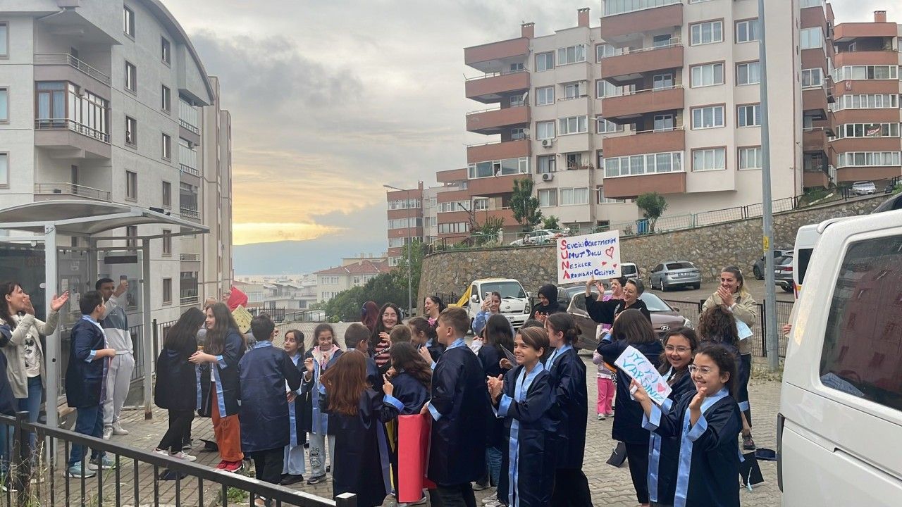 Gemlik ilçesi Cumhuriyet İlkokulu 4-E sınıf öğrencileri, kanser tedavisi görüp mezuniyet törenine katılamayan öğretmenleri Suna Bayrak'a sürpriz ziyaret gerçekleştirdi. Sınıf öğretmenlerinin evinin önünde aileleri ile birlikte toplanan öğrenciler, yazdıkları 'Sevgili öğretmenim umut dolu nesiller ardından geliyor', 'Özlendin be Suna Hocam, 'Sizi seviyoruz öğretmenim' pankartları açtı. Öğrenciler müzik eşliğinde gösteri yaptıktan sonra keplerini havaya attı.