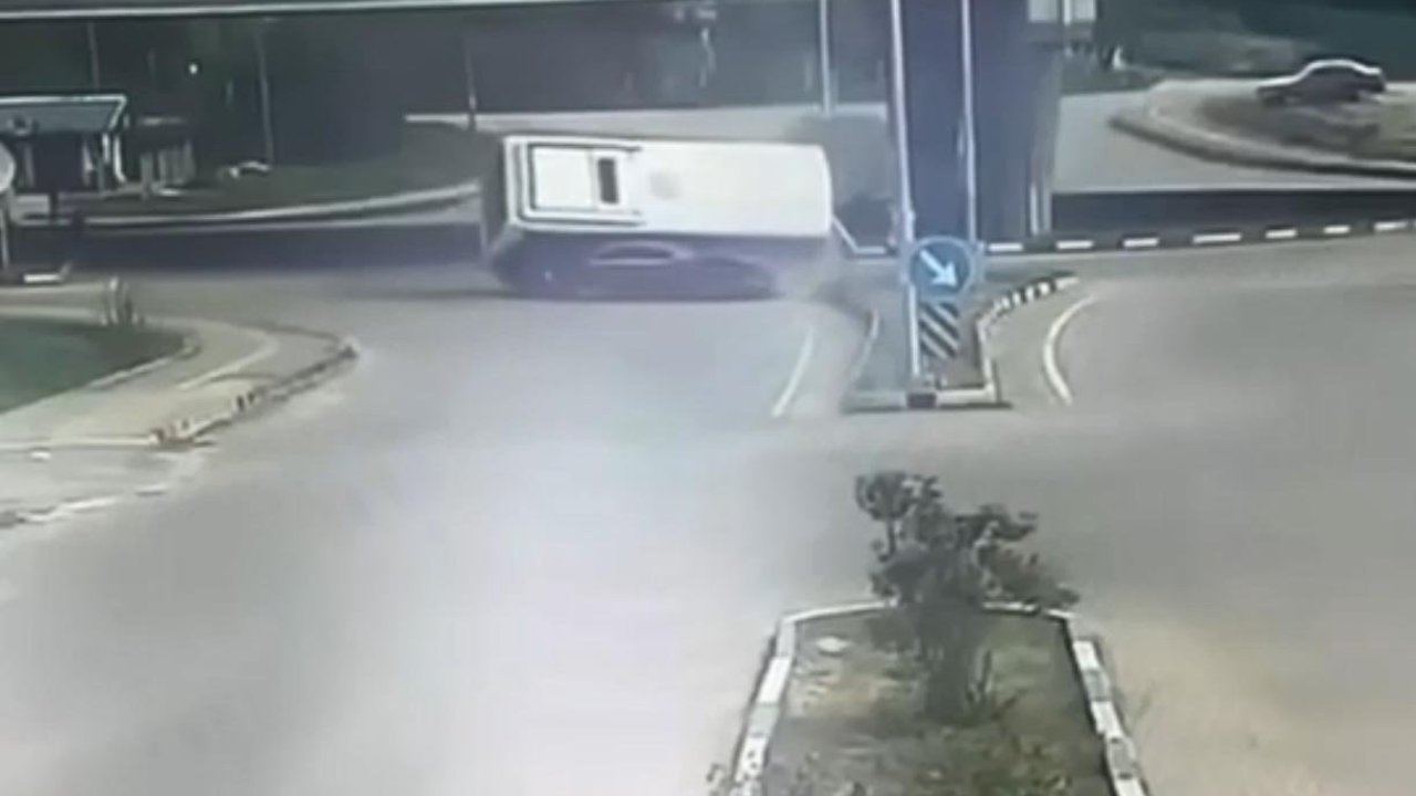 Bartın Üniversitesi'ne öğrenci taşıyan özel halk otobüsünün kampüs girişindeki virajda otomobilin üzerine devrildiği kazanan güvenlik kamera görüntüleri ortaya çıktı. Görüntülerde, halk otobüsünün kavşağa girdiği anda hızla gelen otomobilin çarptığı ve otobüsün aracın üzerine devrildiği görüldü. (DHA)