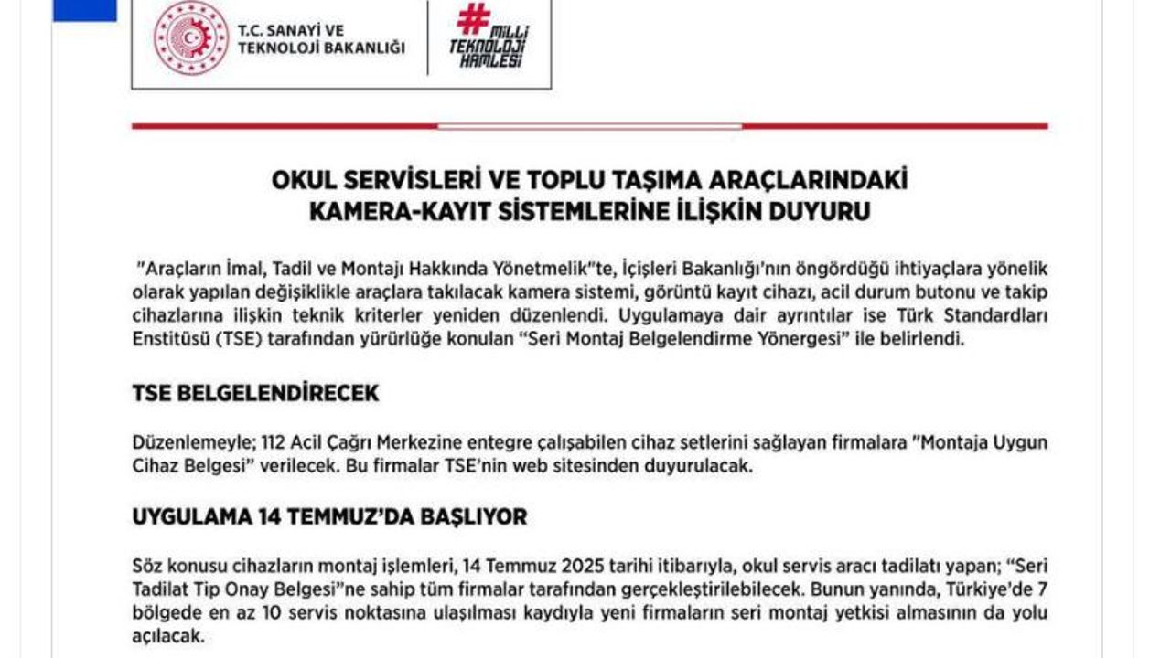 Bakanlığın sosyal medya hesabından, okul servisleri ve toplu taşıma araçlarındaki kamera-kayıt sistemlerine ilişkin açıklama yapıldı. Açıklamada, 'Araçların İmal, Tadil ve Montajı Hakkında Yönetmelik'te, İçişleri Bakanlığı'nın öngördüğü ihtiyaçlara yönelik olarak yapılan değişiklikle araçlara takılacak kamera sistemi, görüntü kayıt cihazı, acil durum butonu ve takip cihazlarına ilişkin teknik kriterlerin yeniden düzenlendiği belirtildi. Uygulamaya dair ayrıntıların ise Türk Standartları Enstitüsü (TSE) tarafından yürürlüğe konulan 'Seri Montaj Belgelendirme Yönergesi' ile belirlendiği kaydedilerek, "Düzenlemeyle; 112 Acil Çağrı Merkezine entegre çalışabilen cihaz setlerini sağlayan firmalara 'Montaja Uygun Cihaz Belgesi' verilecek. Bu firmalar TSE'nin web sitesinden duyurulacak. Söz konusu cihazların montaj işlemleri, 14 Temmuz 2025 tarihi itibarıyla, okul servis aracı tadilatı yapan; 'Seri Tadilat Tip Onay Belgesi'ne sahip tüm firmalar tarafından gerçekleştirilebilecek. Bunun yanında, Türkiye'de 7 bölgede en az 10 servis noktasına ulaşılması kaydıyla yeni firmaların seri montaj yetkisi almasının da yolu açılacak" ifadeleri kullandı.