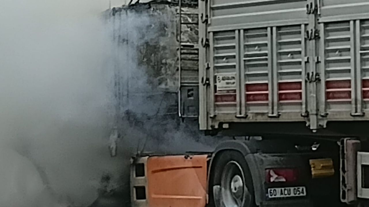 Yangın nedeniyle kara yolunda trafik bir süre durma noktasına geldi. TIR'ın çekicisinin kullanılamaz hale geldiği yangının çıkış nedeninin belirlenmesi için inceleme başlatıldı. (DHA)
