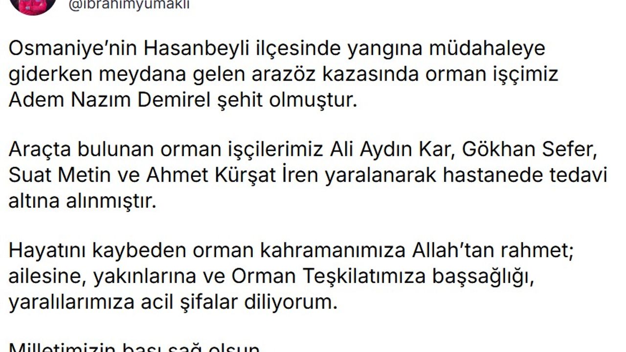 Tarım ve Orman Bakanı İbrahim Yumaklı, sosyal medya hesabından yaptığı açıklamada, "Osmaniye'nin Hasanbeyli ilçesinde yangına müdahaleye giderken meydana gelen arazöz kazasında orman işçimiz Adem Nazım Demirel şehit olmuştur. Araçta bulunan orman işçilerimiz Ali Aydın Kar, Gökhan Sefer, Suat Metin ve Ahmet Kürşat İren yaralanarak hastanede tedavi altına alınmıştır. Hayatını kaybeden orman kahramanımıza Allah'tan rahmet; ailesine, yakınlarına ve Orman Teşkilatımıza başsağlığı, yaralılarımıza acil şifalar diliyorum. Milletimizin başı sağ olsun" dedi. (DHA)