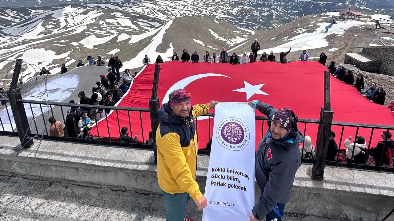 Güneşli havada başlayan dağda otlayan inek sürüsünün arasından geçip, zaman zaman karlı zeminde yürüyen öğrenciler, görüş mesafesinin yer yer 2 metreye kadar düştüğü sise rağmen tek sıra halinde yürüyerek, Palandöken'in 2 bin 900 rakımında 10 dakika mola verdi. Dağcılar burada, 'selfie' çekerek, 19 Mayıs Atatürk'ü Anma, Gençlik ve Spor Bayramı kutlamasını ölümsüzleştirdi. Palandöken'in 3 bin 176 metredeki zirvesine çıkan öğrenciler, dev Türk bayrağı açıp, saygı duruşunda bulunduktan sonra İstiklal Marşı'nı okuyarak, inişe geçti.