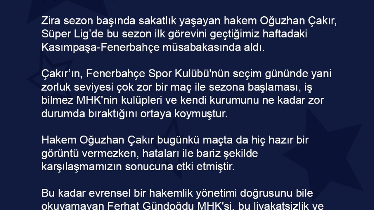 “Trendyol Süper Lig'in 7. haftasında deplasmanda Tümosan Konyaspor ile oynayacağımız karşılaşma öncesinde MHK'nin maçın hakemi olarak Oğuzhan Çakır'ı atamasını şaşkınlıkla karşıladık.