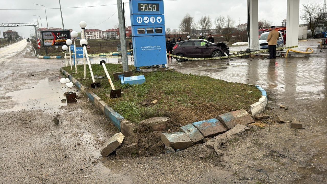 Murat ÖZELCİ/EFLANİ (Karabük), (DHA)- KARABÜK'ün Eflani ilçesinde otomobilin refüje ve akaryakıt istasyonundaki beton bloka çarptığı kazada 1'i çocuk, 5 kişi yaralandı.