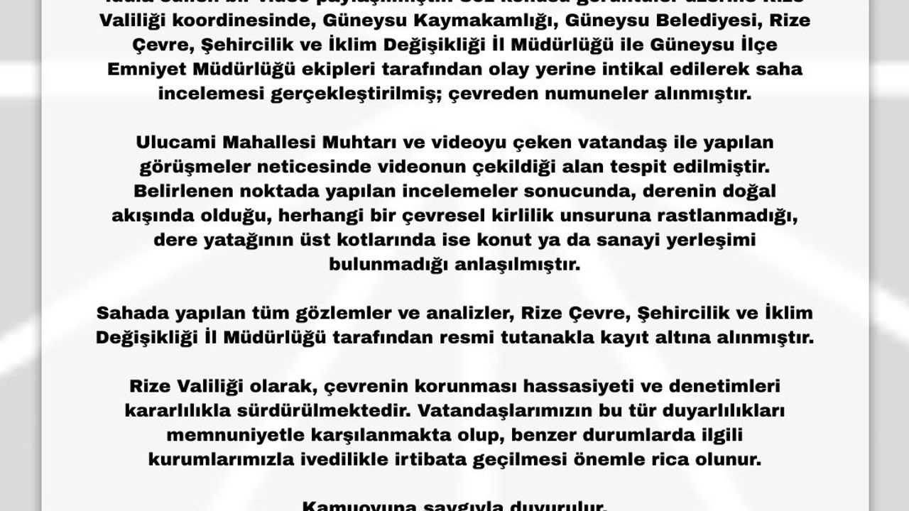 Rize Valiliği de konuya ilişkin yazılı açıklama yaptı. Açıklamada, Valilik koordinesinde Güneysu Kaymakamlığı, Güneysu Belediyesi, Çevre, Şehircilik ve İklim Değişikliği İl Müdürlüğü ile Güneysu İlçe Emniyet Müdürlüğü ekipleri tarafından olay yerinde saha incelemesi gerçekleştirildiği bildirildi. Sudan alınan numunelerin incelendiği belirtilen açıklamada şunlar kaydedildi: "Çevreden numuneler alınmıştır. Ulucami Mahallesi muhtarı ve videoyu çeken vatandaş ile yapılan görüşmeler neticesinde videonun çekildiği alan tespit edilmiştir. Belirlenen noktada yapılan incelemeler sonucunda derenin doğal akışında olduğu, herhangi bir çevresel kirlilik unsuruna rastlanmadığı, dere yatağının üst kotlarında ise konut ya da sanayi yerleşimi bulunmadığı anlaşılmıştır. Sahada yapılan tüm gözlemler ve analizler Çevre, Şehircilik ve İklim Değişikliği İl Müdürlüğü tarafından resmi tutanakla kayıt altına alınmıştır. Vatandaşlarımızın bu tür duyarlılıkları memnuniyetle karşılanmakta olup, benzer durumlarda ilgili kurumlarımızla ivedilikle irtibata geçilmesi önemle rica olunur." (DHA)