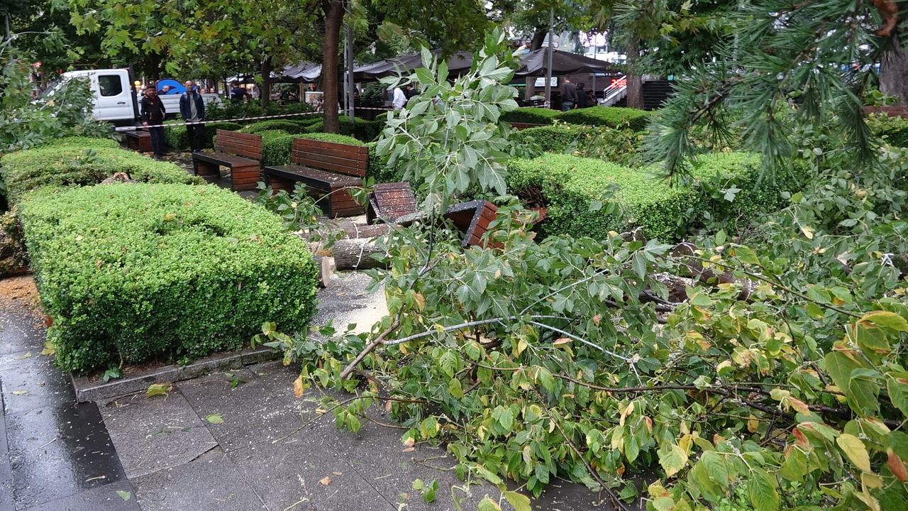 Kentte öğle saatlerinden sonra etkili olan kuvvetli rüzgar, yaşamı olumsuz etkiledi. Meydan Parkı’nda bedeninden kırılan ağaç, bankların üzerine devrildi. Oturma kırılırken, olay sırasında parkta kimsenin bulunmaması olası faciayı önledi. Belediye ekiplerinin incelemesi sonrası çürük olduğu tespit edilen ağaç kesilerek bulunduğu yerden kaldırıldı. (DHA)