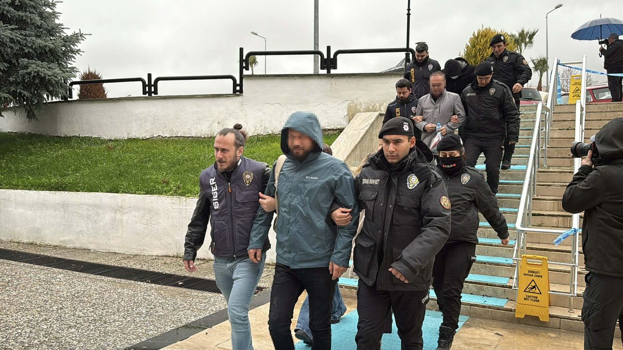 Operasyon kapsamında gözaltına alınan R.K.K., S.K., S.Ü.Ö., P.B., C.D., S.C.S., H.D. ve İ.B., emniyetteki işlemlerinin ardından adliyeye sevk edildi. (DHA)