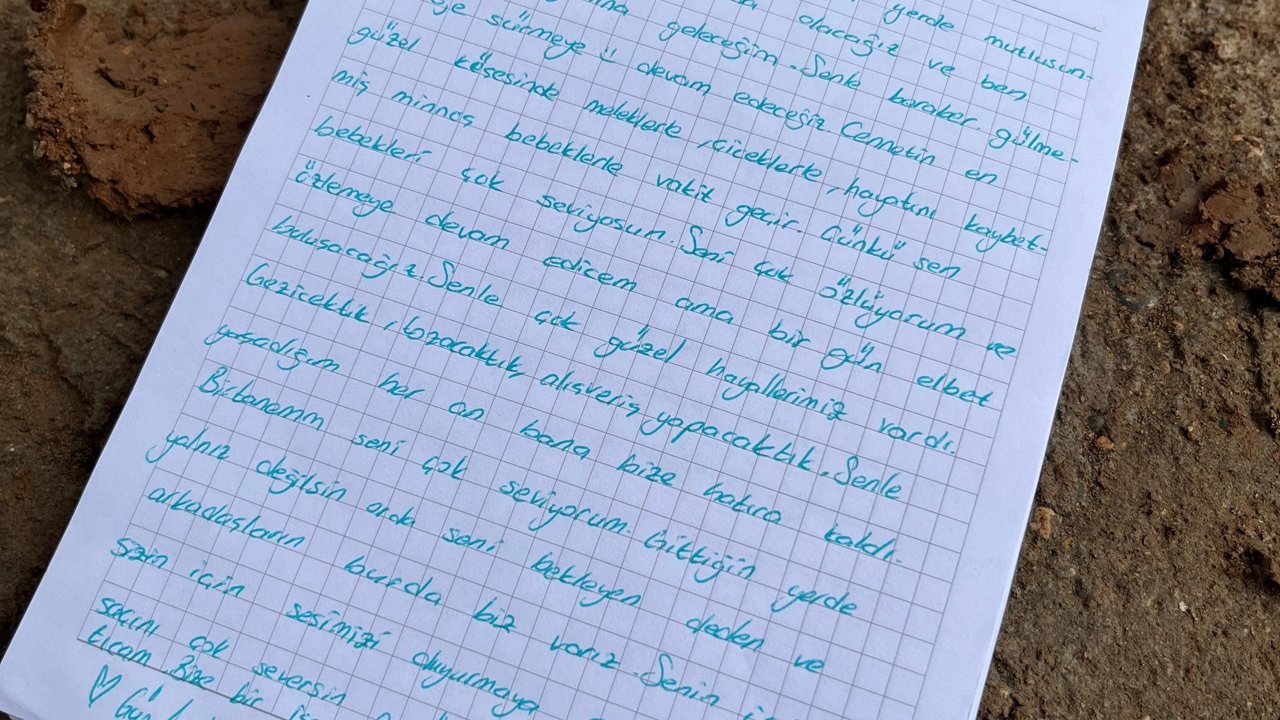 Bir başka notu ise Kahramanmaraş merkezli 6 Şubat 2023 depremlerinde kızını kaybeden bir anne bıraktı. Notta, 'Depremde 4 yaşında kızım Nehir'imi kaybettim. Ona selam söyleyin ona sarılın' ifadeleri yer aldı. (DHA)