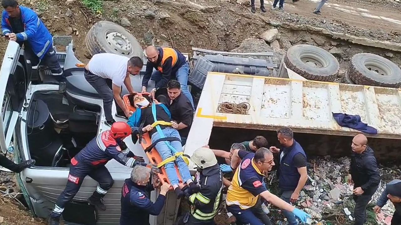 Salim SARIKOÇ/ARAKLI (Trabzon), (DHA)- TRABZON’un Araklı ilçesinde hafriyat kaldırma çalışması sırasında şarampole devrilen kamyonun şoförü Emrullah A. yaralandı.